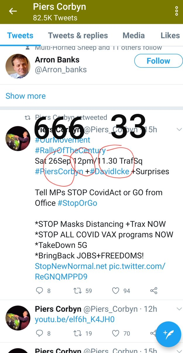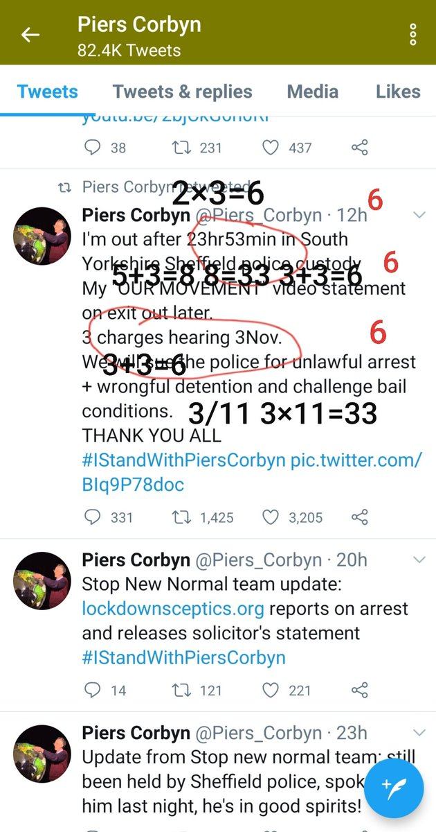 You will start to notice a lot of these 33s and 666s when I show you just how much this freemason uses them in his coded tweets. It is no coincidence. The 33’s indicate that it is the work of freemasonry and that it is a hoax (his ‘arrest’ for example) and the 666s seem to be a code that is used for this so-called ‘second wave’, presumably to be referring to the ‘mark of the beast’ that many believe to be the vaccine.