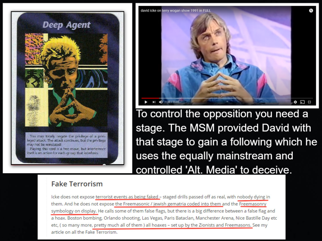 David has spread disinformation about a LOT of subjects: He goes along with the CIA planted conspiracy theory that JFK was assassinated by ‘the illuminati’ when the reality is that the assassination was faked, just like his brother’s was. He peddles the MI5 planted conspiracy that Princess Diana was murdered by the royal family, a view so ‘radical’ that it was the basis of Keith Allen’s 2011 documentary film ‘Unlawful Killing’ which has been shown numerous times on terrestrial TV. If this was the truth do you honestly think it would have even reached pre-production? David, of course, had to put his own spin on it so he came up with a very clever story about it being a Satanic ritual that, I must confess, I fell for until I read Miles Mathis’ ‘Yes, Diana Faked Her Own Death’ essay. Icke’s book ‘Alice In Wonderland & the World Trade Centre Disaster’ is complete disinfo from start to finish and, to illustrate this, Mossad is mentioned only once in the entire book and that is just to clarify that someone was a Mossad agent! Mossad are mentioned so many times in his books yet the one book you’d think they’d be mentioned more than any other they are nowhere to be seen! Icke claims that the planes that were alleged to have flown into the WTC were switched for remote control planes which is an absolute nonsense and he spends an awful lot of time referring to alleged communications between ATC and the alleged pilot which, if these transcripts are real, are certainly completely made up. He also claims that people actually died when it was a completely controlled and staged hoax where nothing happened other than a missile fired at the Pentagon, three empty buildings demolished and CGI planes and ‘jumpers’ added to the footage (who just so happen to be falling in the freemasonic ‘hanged man’ pose). There are also no death certificates on record for ANY of the alleged victims and their press photographs were all photoshopped from other people’s photos – a common trick when these hoaxes are pulled off. No planes, no victims. He also claimed that the cliffs of Dover would be underwater by 1991 and that the world would end in 1997 – I think even the most deluded of Icke cultists would acknowledge he got those wrong. When you make bold predictions like that and they are proven to be false you lose credibility in my opinion and he’s done that a fair few times.