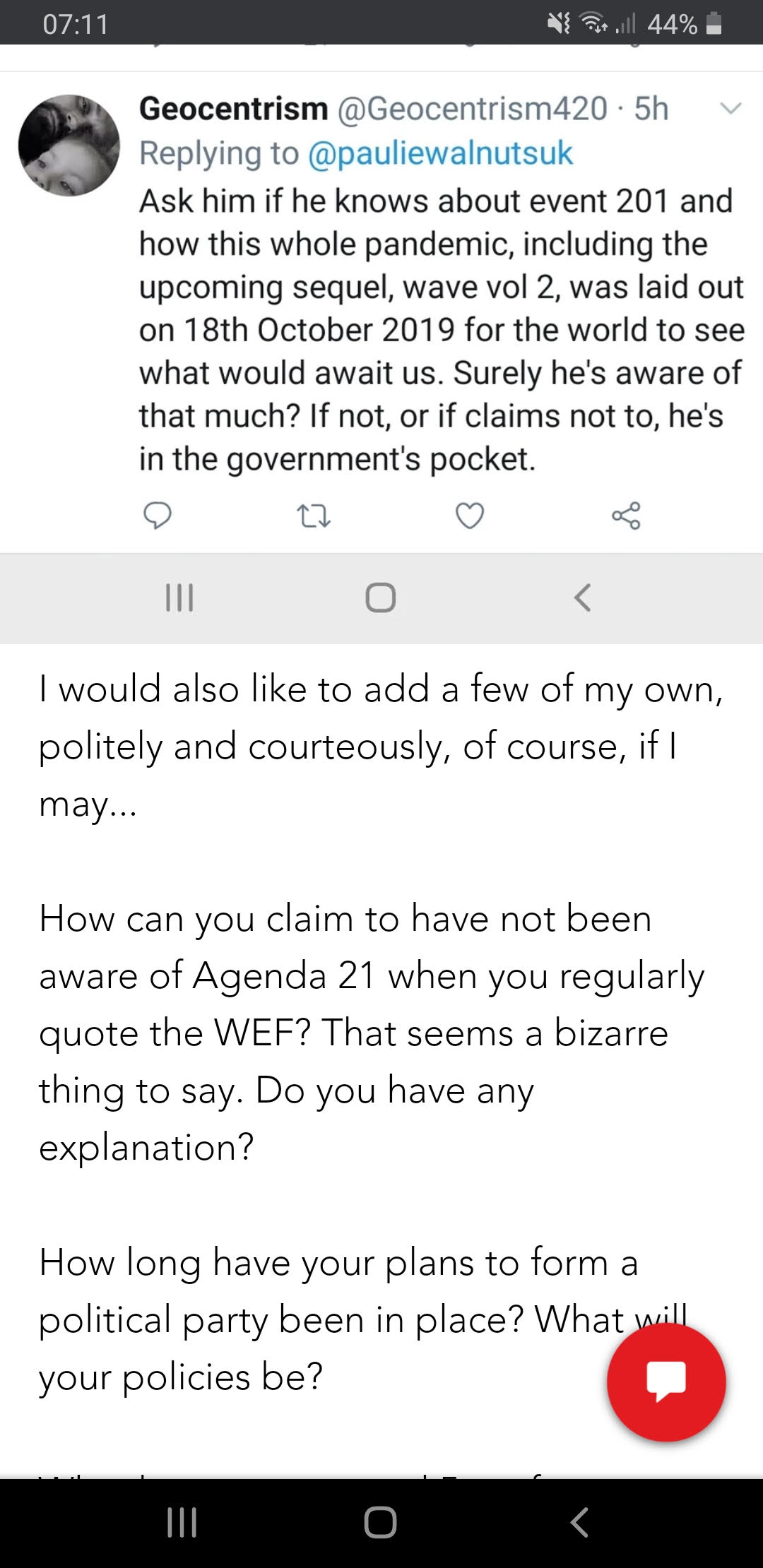 I asked Simon what his and KBF’s position was on a number of topics including Agenda 21/30, 5G, Big Pharma and what their stance on vaccines are as I am very strongly anti-vaccine. He told me that he didn’t know what Agenda 21 was until I just mentioned it… wait, sorry what?! You are telling me that someone who is supposedly leading some ‘freedom movement’ has no idea what Agenda 21 is? The very thing we are being subjugated by right now? And he doesn’t know what it is? When his friend is David Icke? When he was quoting the WEF every day on Twitter? But he doesn’t know what Agenda 21 is?