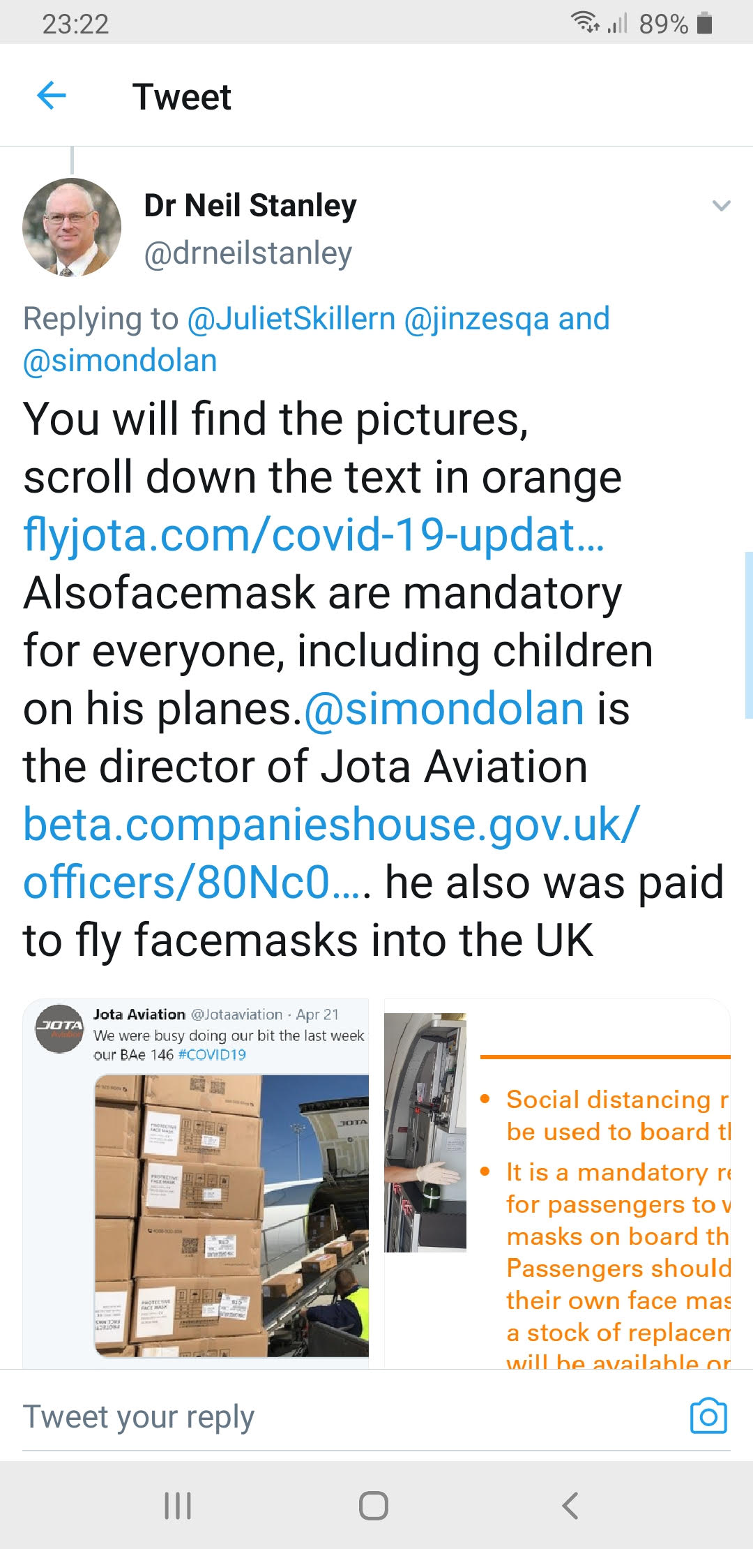 After I had been tweeting about KBF being controlled opposition for around a week or so, I was messaged by someone who I now know is an ‘NHS whistleblower’, allegedly and a freemason – Dan Stevens – telling me he had information on Simon Dolan. I won’t put too much about it here as that is for another very short blog but let’s just say among the things he told me were that Simon’s court case was actually for his own personal £2.4m compensation claim, as mentioned earlier, and also that his private airline, Jota Aviation, forced staff, passengers and children to wear masks – EVEN THOUGH Simon Dolan was constantly telling business owners onTwitter and Facebook to ignore the guidelines and refuse to enforce masks on staff and customers. He even came up with that No Mask Selfie nonsense and all the time he was making people – EVEN CHILDREN – wear masks. Unbelievable hypocrisy.