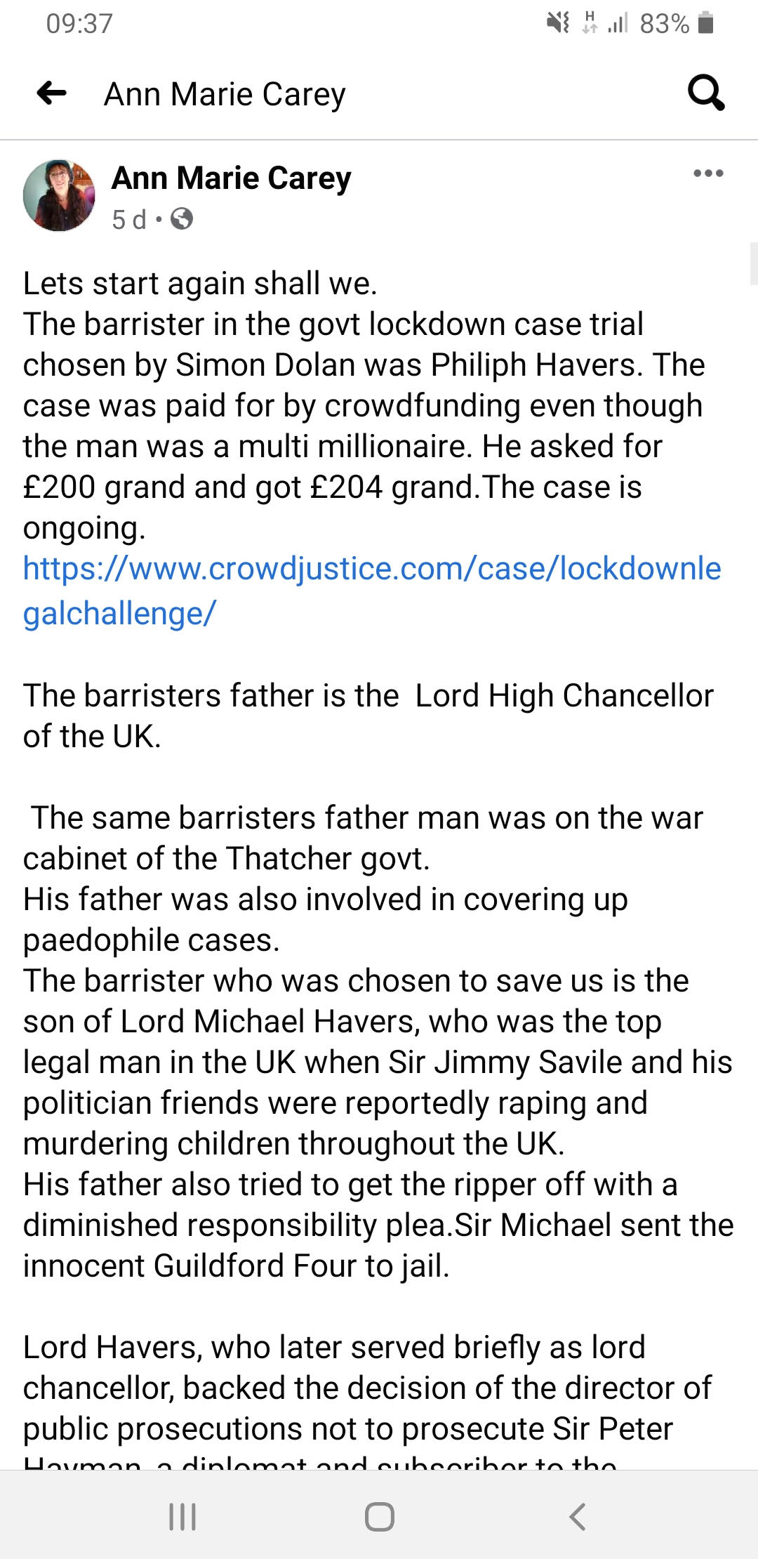 Things got worse when Ann Marie Carey outed Dolan’s barrister as being the son of someone with a very shady record indeed (see pics below). Fortunately for Agent Dolan, there are not too many people in the KBF sheep pen who have any sort of ethics or morality that would prevent them following a man who cons and lies to people, makes kids wear masks, is a proven serial hypocrite, says he doesn’t know what Agenda 21 is which makes him either massively unqualified to (at least publicly) lead this movement or a complete liar and disinfo agent (bit of both tbh). They also don’t have too many followers who question anything or are capable of critical thinking in any way. They just accept any old shit, no matter how low the standards or even what it is half the time and just shuffle along in circles with the herd.