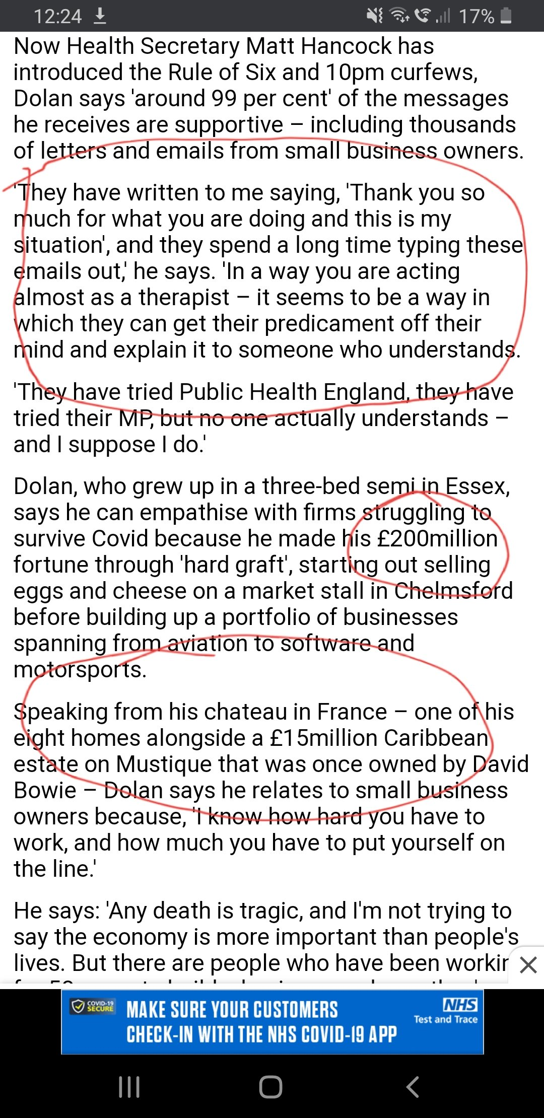 So quite a few numbers to be gained from that move, although nowhere near the ‘millions’ they claim to speak for on their website. They also had the opportunity to harvest everyone on our group’s personal info and that is what I suspect they did. So now KBF have a following, ‘someone’ setting up a crowdfunding for them to pay for the barrister’s fees (more on that shady fucker later) for Simon Dolan’s £2.4m private compensation claim against the government for loss of earnings for his PR Firm. Only he makes out that he is doing this great deed for the public out of the kindness of his heart and, just like the Emperor’s new clothes, nobody seems to mention the fact that this man is a multi millionaire yet has the very people he claims he is standing up for because they face economic hardship paying for his own court costs to make himself £2.4m richer on top of his £200m fortune!