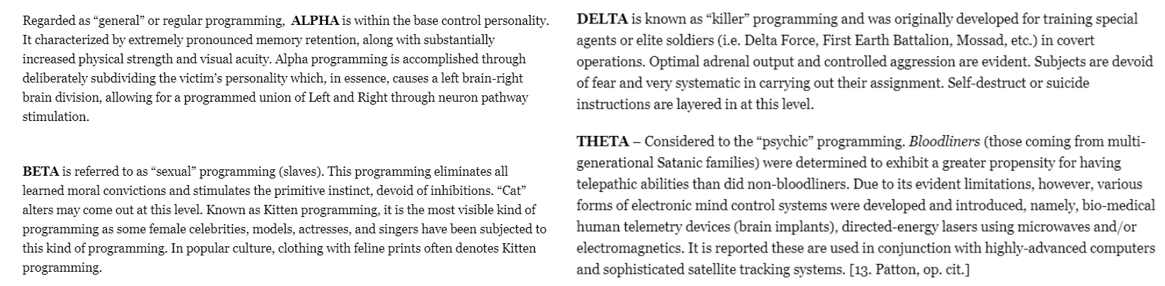 Dissociation is created by subjecting the victim to traumatic abuse and occult rituals and once the split is achieved an ‘internal world’ can be created and alters can be programmed using symbols, music, films and fairytales – the most common of which are The Wizard of Oz and Alice in Wonderland. You’ll see these referenced a lot in popular culture to symbolise Monarch programming. There are four types of alters that are created, all named after brain activity during various stages of consciousness – Alpha (‘normal’ state), Beta (‘Sex slave’ programming), Delta (‘Assassin’ programming) and Theta (‘Psychic’ programming).