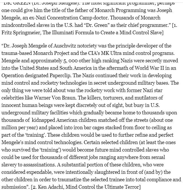 ‘Monarch’ programming, which contains elements of Satanic Ritual Abuse (SRA) and Multiple Personality Disorder (MPD), can be traced back to the Egyptian Book of the Dead, a compilation of rituals that is studied by those in secret societies today, and the methods described – torture and intimidation to create trauma, the use of potions (drugs) and the casting of spells (hypnotism) to create a completely enslaved, obedient initiate. Black magic, sorcery and demon possession is also described and these were all ancestors of the Monarch program. One of the first to study trauma-based mind control at length was the notorious “Angel of Death”, Josef Mengele, the SS physician who performed gruesome experiments on prisoners in the labour camps, particularly on twins – and that’s something to remember for later. The research carried out by Mengele was later used by the CIA for their own mind control projects. Fritz Springmeier claims that Monarch programming is used for various purposes by various secret groups known collectively as ‘The Network’ that are linked to the Committee of 300. The name comes from the Monarch butterfly, which is often used to symbolise the use of MK Ultra in various music videos, films, photographs etc. The butterfly symbolises the stages of transformation within the initiate as they undergo the process: The caterpillar (undeveloped potential), the cocooning (programming) and the emergence as a beautiful butterfly (the Monarch slave). 75% of victims are female as they can endure the most pain and they are known as ‘slave’, the controllers as ‘master’ or ‘god’. The handlers seek to partition the mind, rather like the way you can partition your hard drive, in a number of gruesome, cruel and ruthless ways: