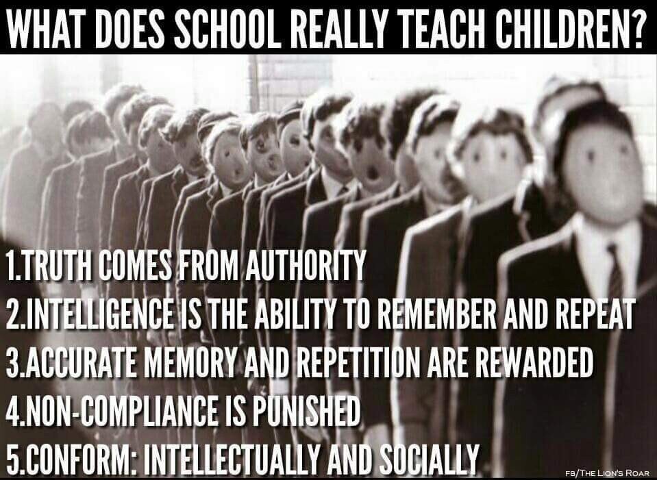 We are already well on the way there with a one size fits all curriculum pushed by the state (what could go wrong?) where questioning anything your teacher says makes you a ‘problem’ (I know this from experience). Children are taught to defer to their teachers and what they tell them, regardless of whether or not they are right, and this can never be right. Children are taught literal lies in every subject and this is a major part of why so many people cannot wake up to this very clear and obvious ‘covid’ hoax. They literally do not know how to think critically and they were certainly never taught to at school (neither was I) and they were just taught to obey their teachers, do as they are told, believe everything their teachers tell them is gospel and learn to recall literally useless information to remember for a test that will define how intelligent they are as people…