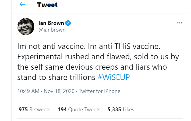 I briefly mentioned Ian Brown last time as I got banned from Twitter after one of those false idol-worshipping fake awakes reported me for telling the truth about ‘him’ – namely that ‘he’ is a freemason, a Devil puppet and a liar. A fake, a phoney, a fraud. How are these ‘awake’ people sleeping on this one? “I am the resurrection and I am the light…”, “I don’t have to sell my soul, He’s already in me…”, “The Second Coming”, “From Chaos to Harmony”… really? Let me put you in the picture, let me show you what I mean: This scumbag went out of ‘his’ way to say ‘he’ isn’t anti-vaccine which, if these fake-awakes actually were awake, they’d know means that ‘he’ is controlled opposition. Not only that, ‘he’ claims to have a family member suffer from vaccine injuries – does that not sound odd to you? Someone in your family suffers from vaccine poisoning and you are NOT anti-vax?! Really?! I don’t think so. No wonder he doesn’t want the identity known – ‘he’d get exposed for making it all up! This is just sick mockery and these dippy, starstruck little fangirls are taken in like the rats that were taken in by the pied piper’s pipe! This is exactly why I refused to publish some letter ‘he’ wrote about John Robb on my website when someone claiming to be ‘his’ agent or publicist or whatever it was asked me if I would. Understand, I was a massive Roses fan from the age of about 12/13 but that’s irrelevant – ‘he’ lies about vaccines, ‘he’ lies about people in ‘his’ family dying which is pure lowlife behaviour, ‘he’ flashes up freemasonic signs on multiple occasions – freemason.