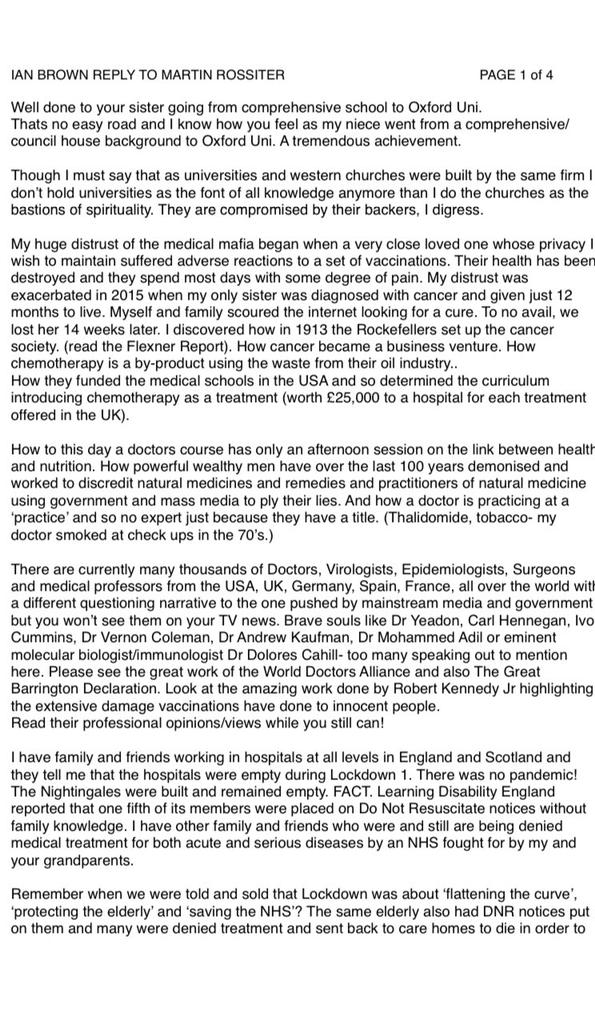 Covid-19 is just a bad flu/’bioweapon’ created in China and the governments of the world have bodged up their ‘disproportionate response’. Vaccines are OK but this Covid-19 one is dodgy because it will turn you into a zombie/cyborg.