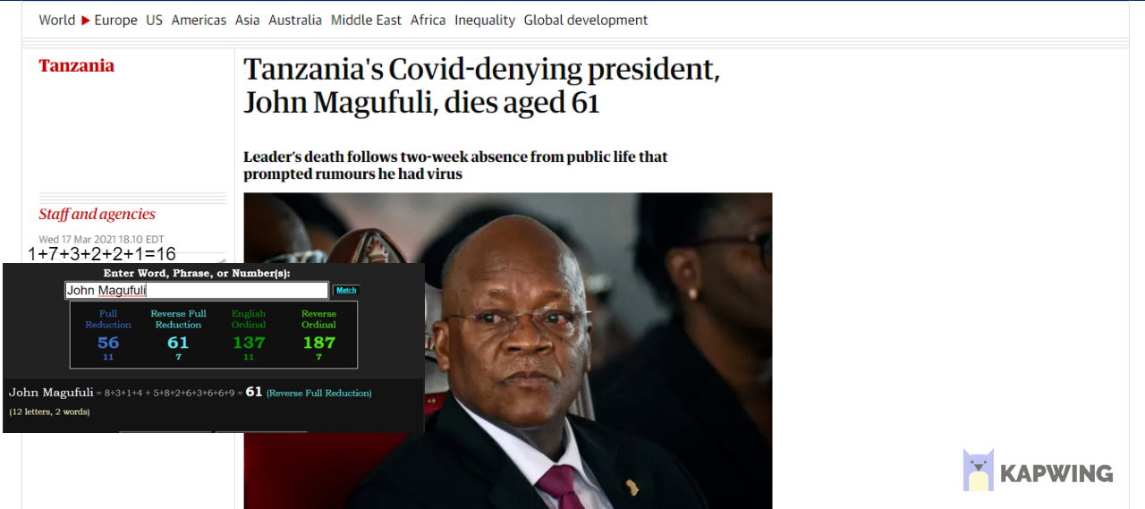 It was the same with Brandy Vaughan and ‘her death’ – this is another mason faking their death when they’ve served their purpose. They were not killed for telling the truth and they were not sacrificed. When you research these cult members they have the same pattern time and time again in their methodology as I showed in the Terrorvision blog. We’ve just recently seen another manufactured ‘hero’, John Magufuli, the Tanzanian President, supposedly ‘die’ and we are meant to think that he has been assassinated by the illuminati because we are not meant to see that he ‘died’ aged 61, that his name is 61 in one cipher (and 56 for the Society of Jesus in another), that the date of this supposed death comes to 16 (61 inverted) in numerology and so on. We also should know that the ‘news’ of him testing a paw paw and a goat for ‘coronavirus’ and his supposed opposition to this agenda would never have been made known if they didn’t want us to know and they’d only want us to know if they wanted us to believe this nonsense too. He is just another false hero to make us think there are people out their in ‘power’ fighting our corner when everyone in the public eye is controlled. I would recommend watching this video by Russianvids that shows some of the things people need to look out for if they don’t want to get conned.