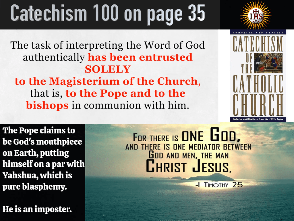 So, from the very start, the Catholic Church was defying scripture by the very appointment of a Pope – literally assuming the position of Yahshua (‘Jesus’) – and we can see numerous examples of blasphemy among the doctrines and traditions of the church. They use ‘catechisms’ – “Formal indoctrination in the tenets of a Christian denomination” (The American Heritage Dictionary of the English Language, 5th Edition) – to do this and we’ll take a look at a few examples.
