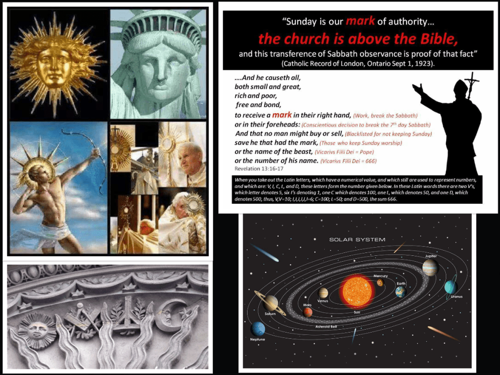 A very obvious starting point would be the pagan trinity of Sun God (Nimrod), Moon Goddess (Semiramis) and their son, Sun God reborn (Tammuz) which the Catholic Church have used God, Mary and ‘Jesus’ as different names to trick believers into worshipping pagan gods. The trinity of the Catholic Church is based on paganism and not scripture. This is not opinion, this is fact. Mary did not remain a virgin – The Bible tells us that she had further children with her husband, Joseph – and the ‘Queen of Heaven’, as she is referred to by Catholics, is another name for Ishtar (Semiramis) – the whore of Babylon – according to scripture. This should tell you who Catholics are unwittingly worshipping…