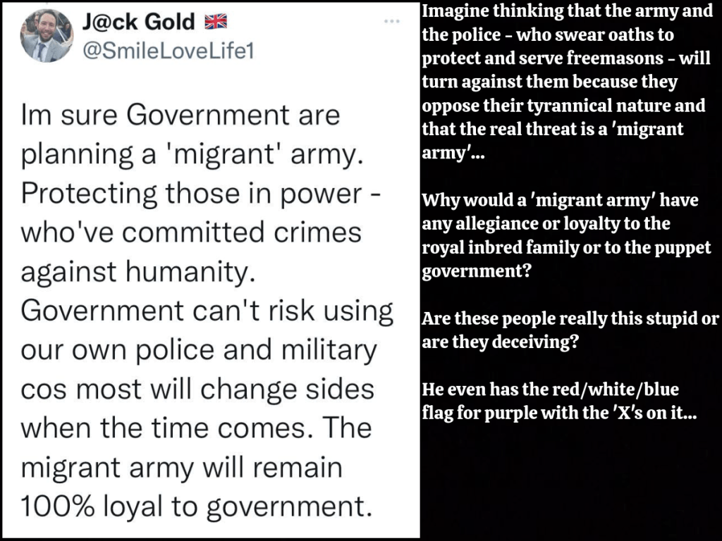 Jo plays the role of a ‘dissident’ (in her own mind) who would ‘resist the army at her door’ (because she pushes this fearporn crap) – the same army who wear camouflage jackets with freemasonic symbolism on them like her ex, I might add – yet, in reality, she is a police informer (at best…) who literally thinks free speech should be criminalised, as she has demonstrated – like a few others among this hypocritical bunch of fake, self-proclaimed ‘freedom fighters’ have.