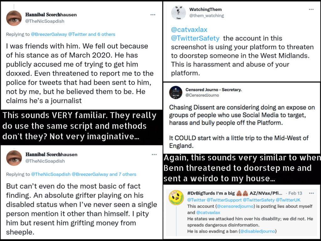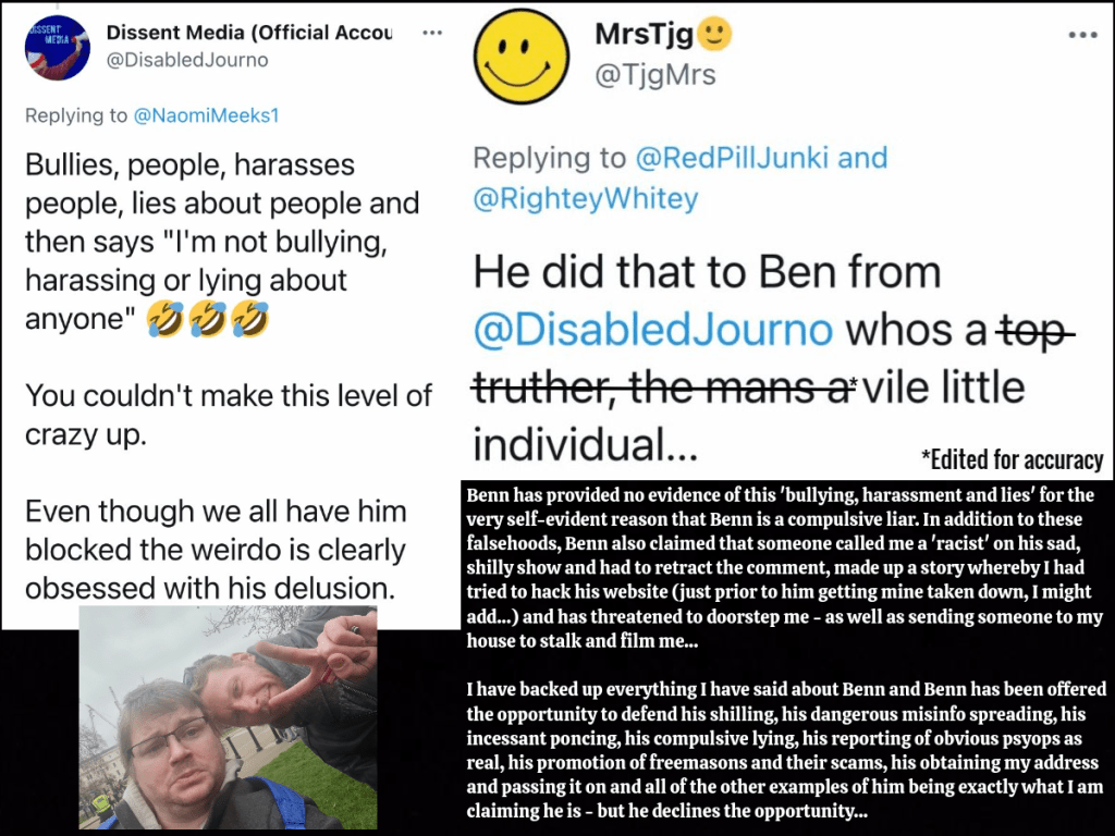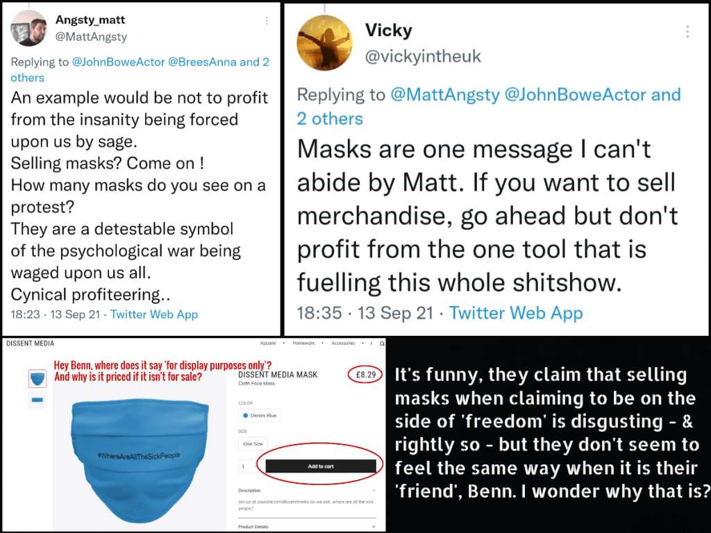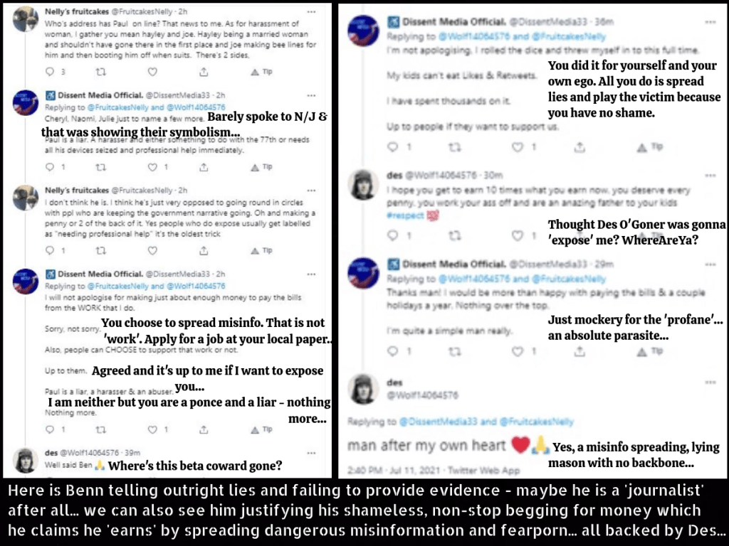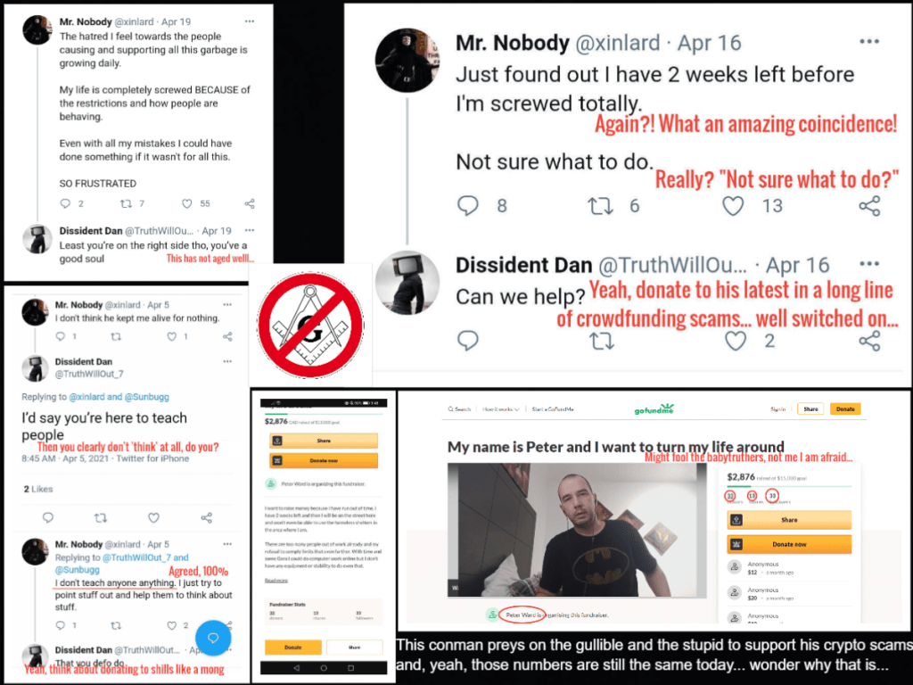 Examples of this would be how she claims to be against people scamming and poncing for money yet very much appeared to be helping to set up one of (notorious Twitter scammer/shill) Mr. Nobody’s many freemasonic scams (“Watch out for freemason symbology”) and supports Dissent Media who she knows full well are ponces and spreaders of misinfo – not least because she asked me in February 2021 whether Benn was a ‘shill’ to which I replied ‘obviously!’. You’d have thought filming empty test centres when we know there is no virus would have been a giveaway…