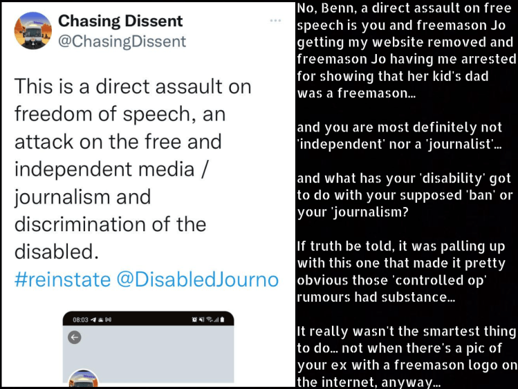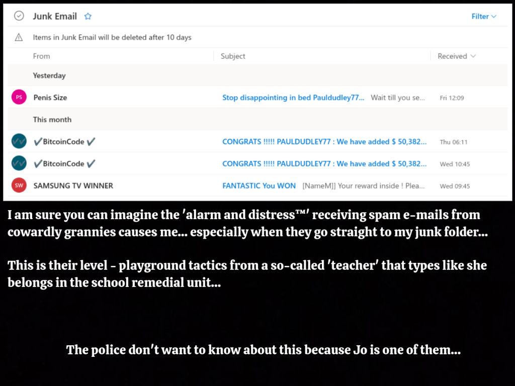 Jo literally had me arrested for stating the fact that her ex had a patch of a freemasonic symbol in a photo from a publicly available website – this is literally what she believes in and so do all of the people who support her actions. This is someone that ‘F’s and ‘C’s like a trooper yet she was ‘alarmed and distressed™’ by being called a name in an e-mail and by seeing a photo she’s seen before of her ex with a freemasonic patch?