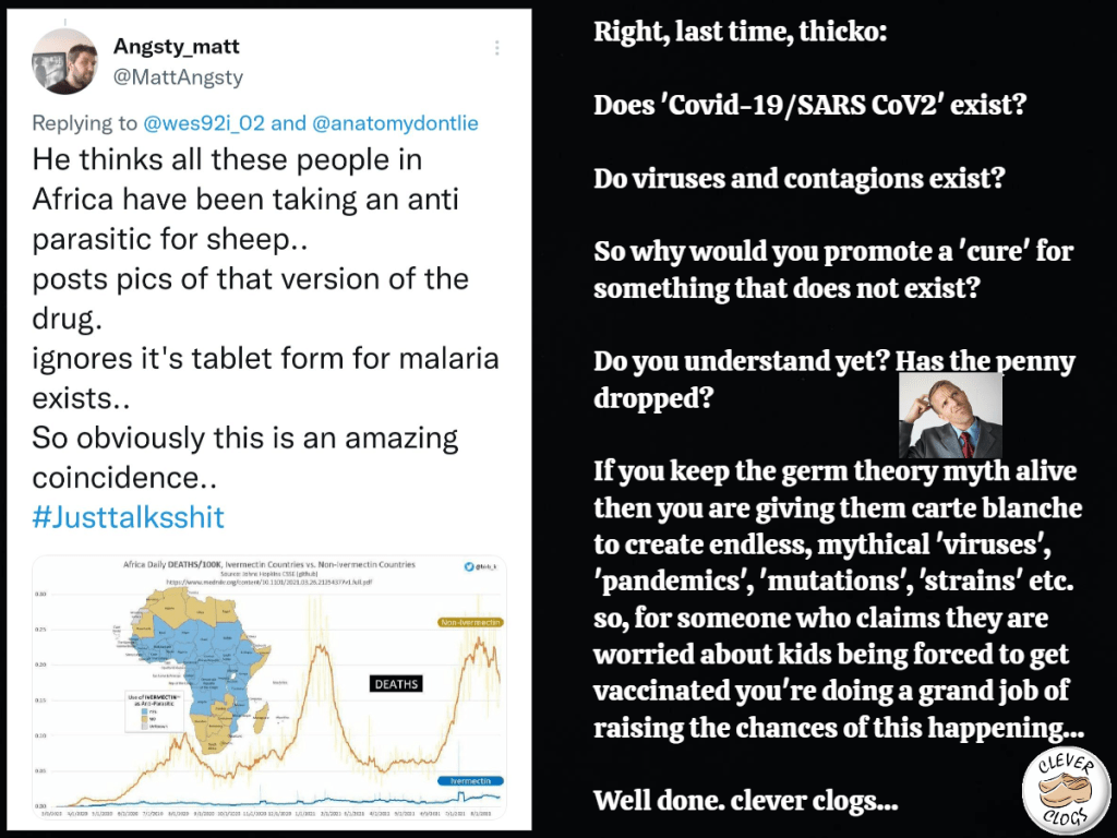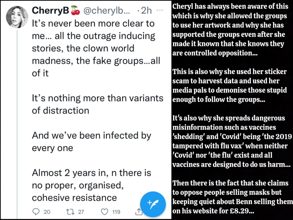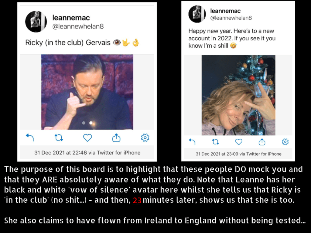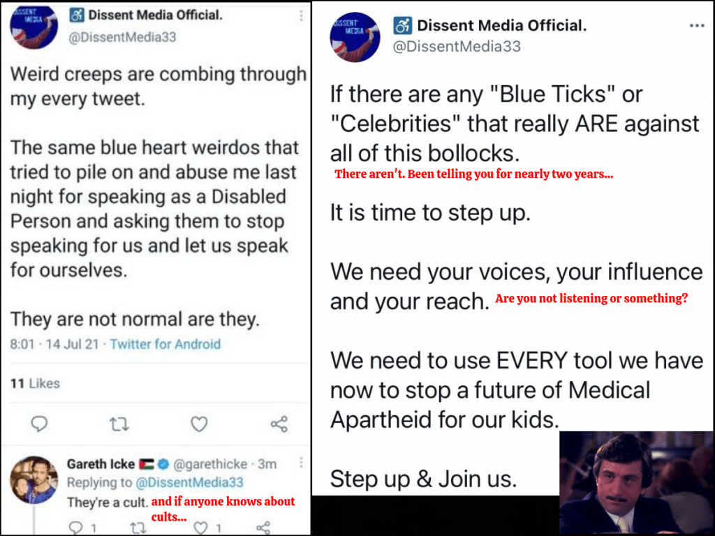 Just as I have pointed out regarding Ian Brown, this is a direct contradiction and completely at odds with how people act in real life. I certainly know that if I had someone close to me that had been injured by vaccines I would be calling out Des and Cheryl for pushing their divisive lies (I did anyway…) and questioning why they are suddenly now claiming that ‘Covid’ exists and is the ‘tampered flu vaccines’ (which distracts from the fact that ALL vaccines are unnecessary toxic poison designed to do us harm – obviously). The last thing I’d be doing is pushing their dangerous misinformation that will enable more people to be damaged by vaccines…