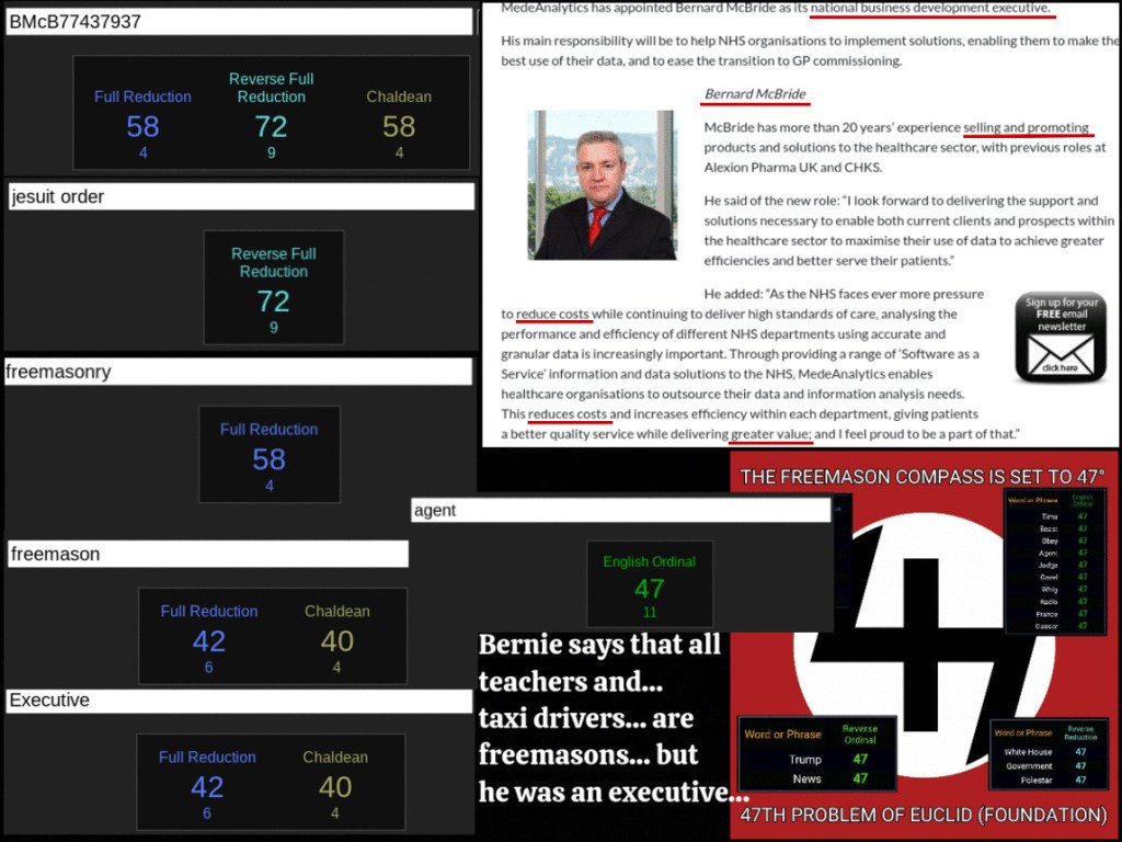 Bernie also ‘proudly’ worked as an ‘executive’ (42 in Full Reduction, 40 in Chaldean – like ‘freemason’ because that’s what executives are) for a firm assigned to ‘cut costs’ for the NHS or, in other words, to reduce the money spent on it…