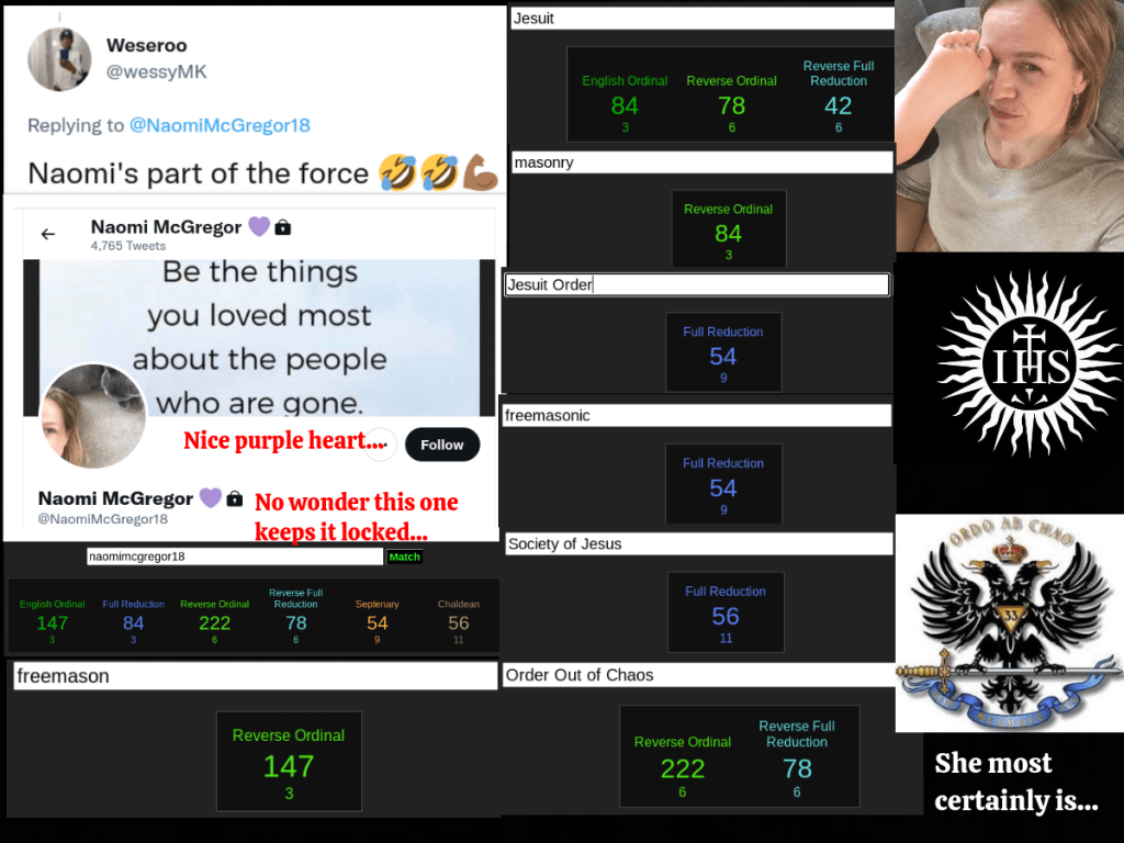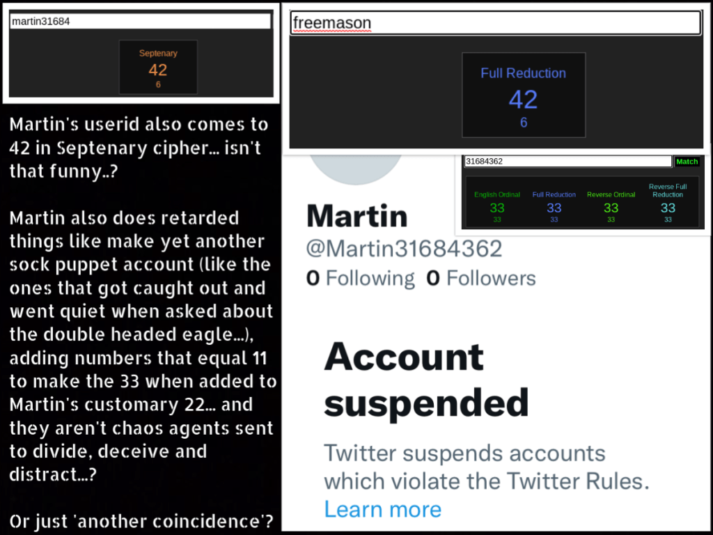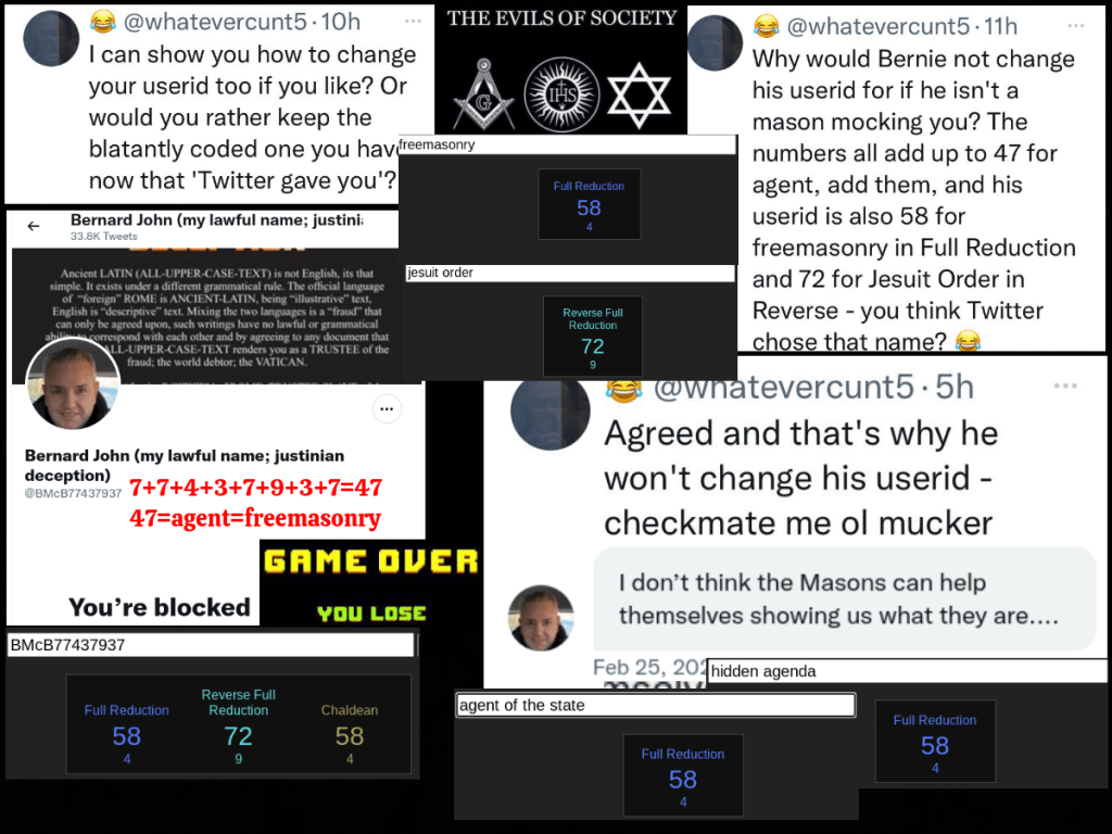 He shows us this in many ways – the most obvious being the gematria of his userid that ‘Twitter gave him’ being 58 for ‘freemasonry’ in Full Reduction (and Chaldean) and 72 for ‘Jesuit Order’ in Reverse Full Reduction. What an amazing coincidence, eh? If Twitter had ‘randomly’ assigned him these numbers then why would he not change the userid? The same reason that Des didn’t – to mock us…