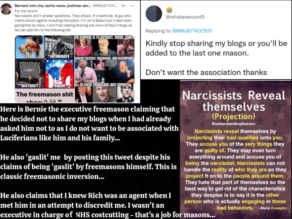 Bernie knows full well that I am not a freemason, not least because he is one, and his cowardice, lack of intellect and narcissistic behaviour only emphasises that as this is typical of these devils in human form.