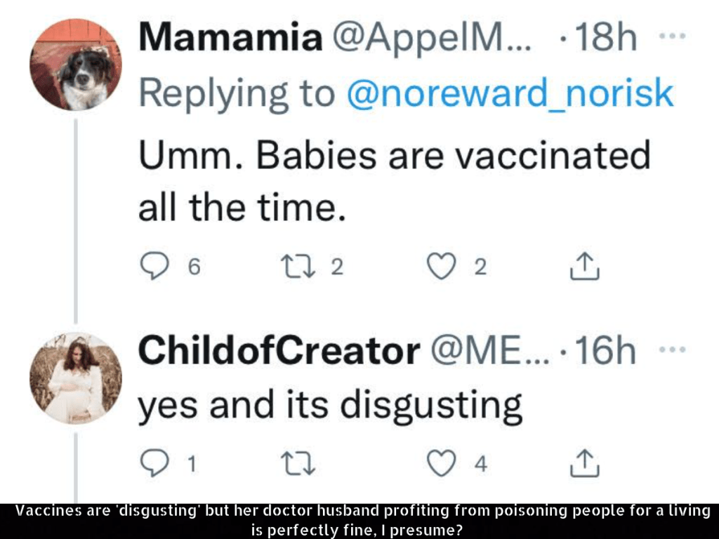 It’s also odd to see someone that supposedly has family members damaged by vaccines not putting two and two together regarding the ‘anti-vaxxer’ married to a doctor who literally profits from poisoning people – another example of the stories we are told making little to no sense. It is worrying how many people don’t seem to question this glaring contradiction – how can you oppose ‘medical tyranny’ when you are married to a doctor? What are the chances of a doctor with his own practice not being a freemason? And how does a ‘homeschooler’ have kids that go to school?