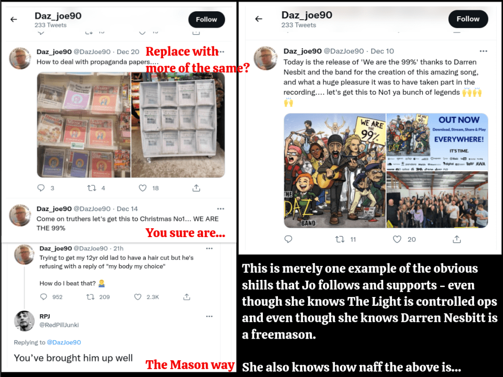 Jo just retweets the many freemasonic shills she follows on Twitter – particularly anything involving fearporn – shares videos with obvious freemasonic symbolism in (she even mocks/warns people to “Look out for freemason symbology” – you think she doesn’t know what a double headed eagle represents?) and moans about the shilly crap her followers post even though she knows all they do is post shilly crap. It’s just posturing and attention seeking. It’s a bit naff, in all honesty…