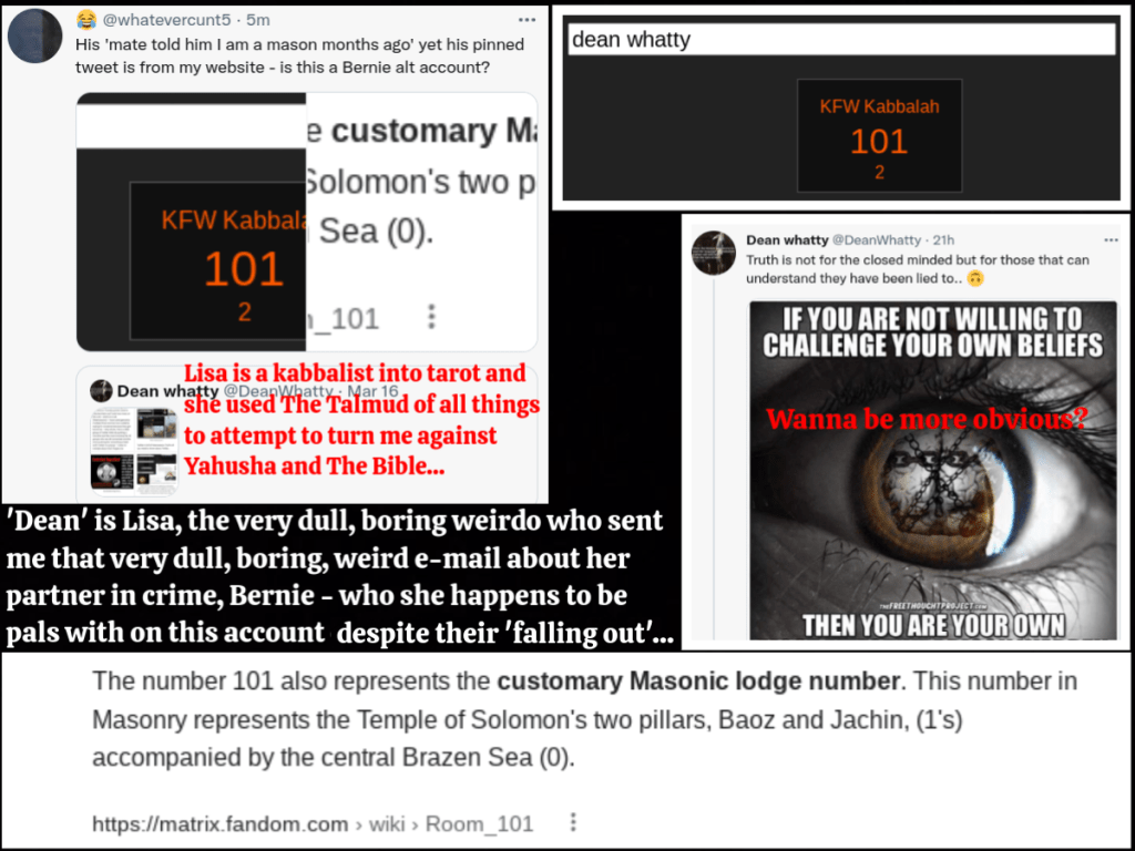 Lisa also showed up in the guise of ‘Dean Whatty’, a supposed ex-Marine (royal paedophile protector) who used the same story that Lisa and Bernie have both used against each other when working in tandem to try and discredit me.