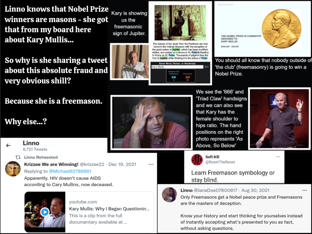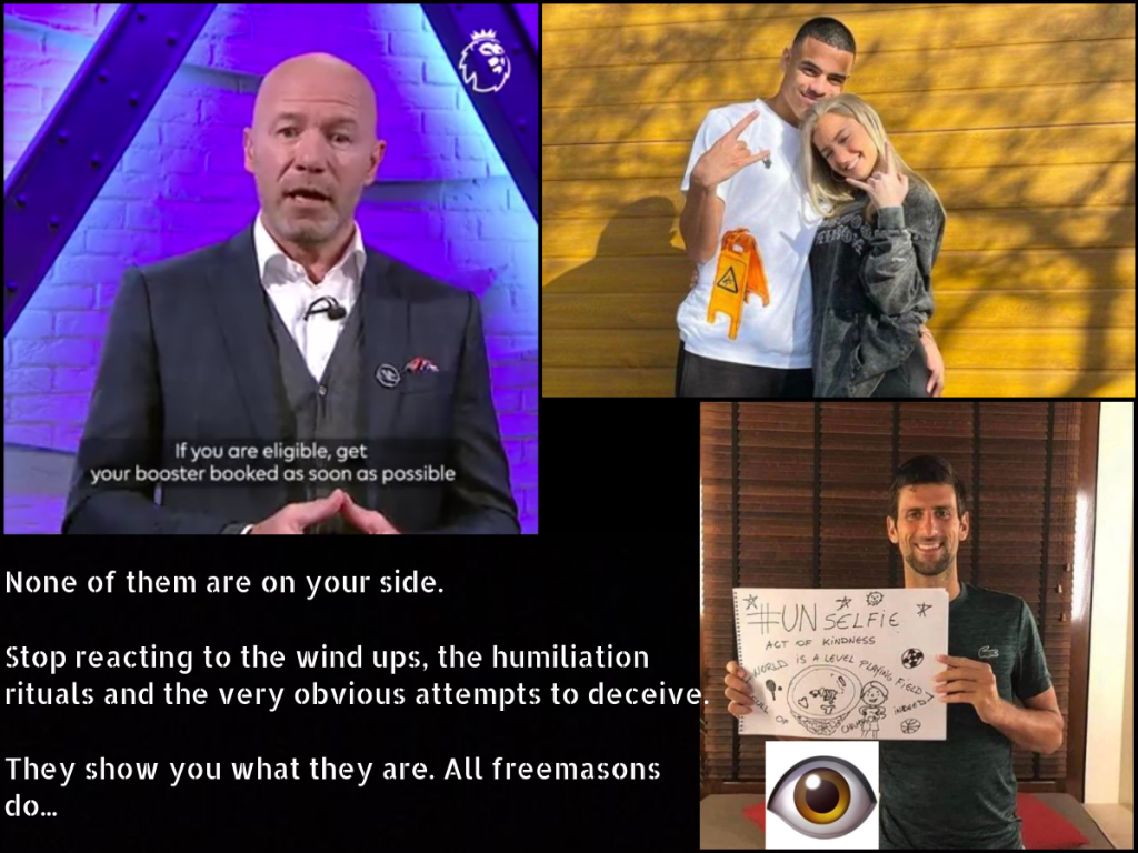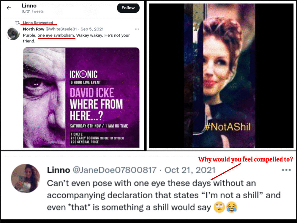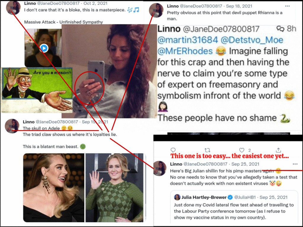 The agents like Jo who push narratives that we know they know are false are very obvious ones – and we’ll see other examples later. Jo had to go from playing a KBF/Q puppet (who fell out with me in August 2020 because I spoke out about the David Icke protest/ritual – “Why are you so divisive? Uniiitttyyy!!!”) to someone suddenly seemingly into the same things as me in order to lure me in – and this draws attention to the freemasons and shills she follows and the psyops she retweets…