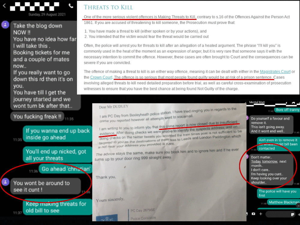 I had turned up to ask why my allegations of death threats had been ignored, among other things, and I was told several different tales by several different officers. I was initially told that they had closed the crime report because they “couldn’t get hold of me”. When I explained that I had a letter telling me it had been closed two months earlier because they claimed they couldn’t find him they changed their story. It then magically became ‘open’ again so watch out Matthew, I am sure the police will be at your door any time soon… oh no, wait… apparently it’s closed again…