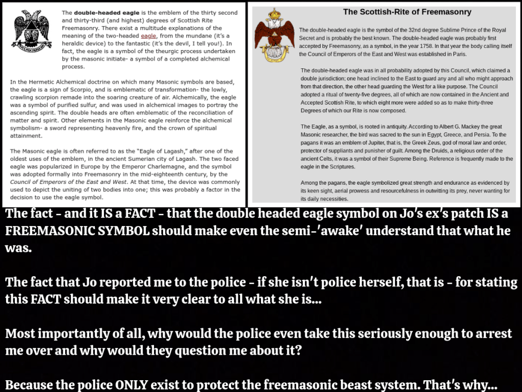 Jo bizarrely told the police that her deceased ex-boyfriend and father of her three children – who left them TWENTY FIVE YEARS ago, according to her, I might add! – was her ‘partner’ (an incredibly odd – and completely untrue – thing to say…) and claimed that me showing a photo of him very clearly wearing an army jacket with the literally freemasonic double headed eagle symbol (complete with pyramid and sword) was done to cause ‘alarm and distress’™ (standard police script) to her (even though the post wasn’t to her and we’d blocked each other…) and that I don’t really believe that he was one…