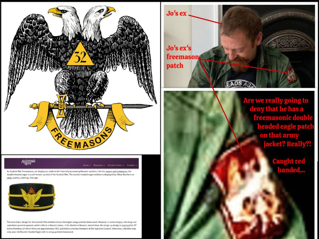 The most obvious red flag here would be why Jo’s reaction to a photograph of her kids’ father with the double headed eagle symbol of freemasonry on his army jacket would be to call the police and defend his ‘honour’ – especially when they haven’t been together for a quarter of a century. My reaction in Jo’s position would have been one of curiosity, amazement, disbelief – I’d want to know more of why I didn’t know about this and what else had been kept from me – especially as Jo claims to be all about the ‘red pills’, ‘awake’ crowd and other controlled op terms.