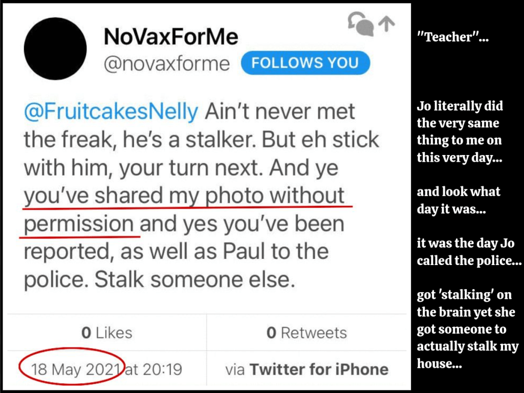 Let’s also consider why Jo would give up her job to doss around on Twitter for a year inciting people to ‘rise up’ against the police she laughably claims to oppose – even having the front to mock me for being out of work after I’d lost my job (unlawfully) for refusing to wear a mask, I might add – and then return to teaching (supposedly) as a supply teacher before jacking it in to work somewhere she could have applied to work when she supposedly ‘left teaching’ in May 2020. If she didn’t want to go back to teaching then why did she not look for other employment during the year that she was somehow able to take off without struggling to pay her mortgage?