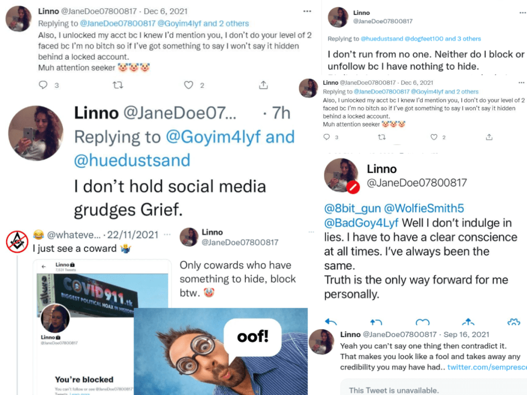 An example of the type of pointless lies Jo tells is her claim that she didn’t follow freemasons Donald Trump, Paul Joseph Watson and David Knight on Gab in January 2021 when I showed screenshots of her doing so – with an account created in January – in May. These types of lies are the very worst in my honest opinion because, if you’d lie about something as trivial as that, what wouldn’t you lie about…?