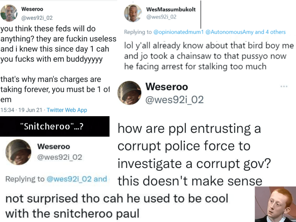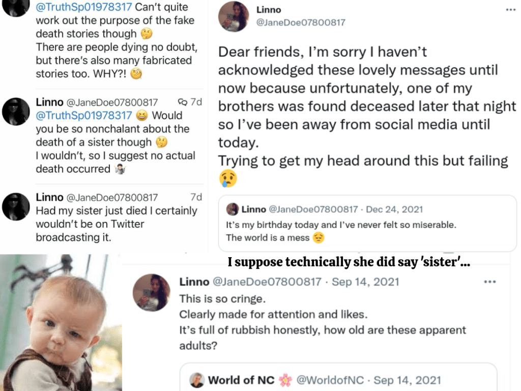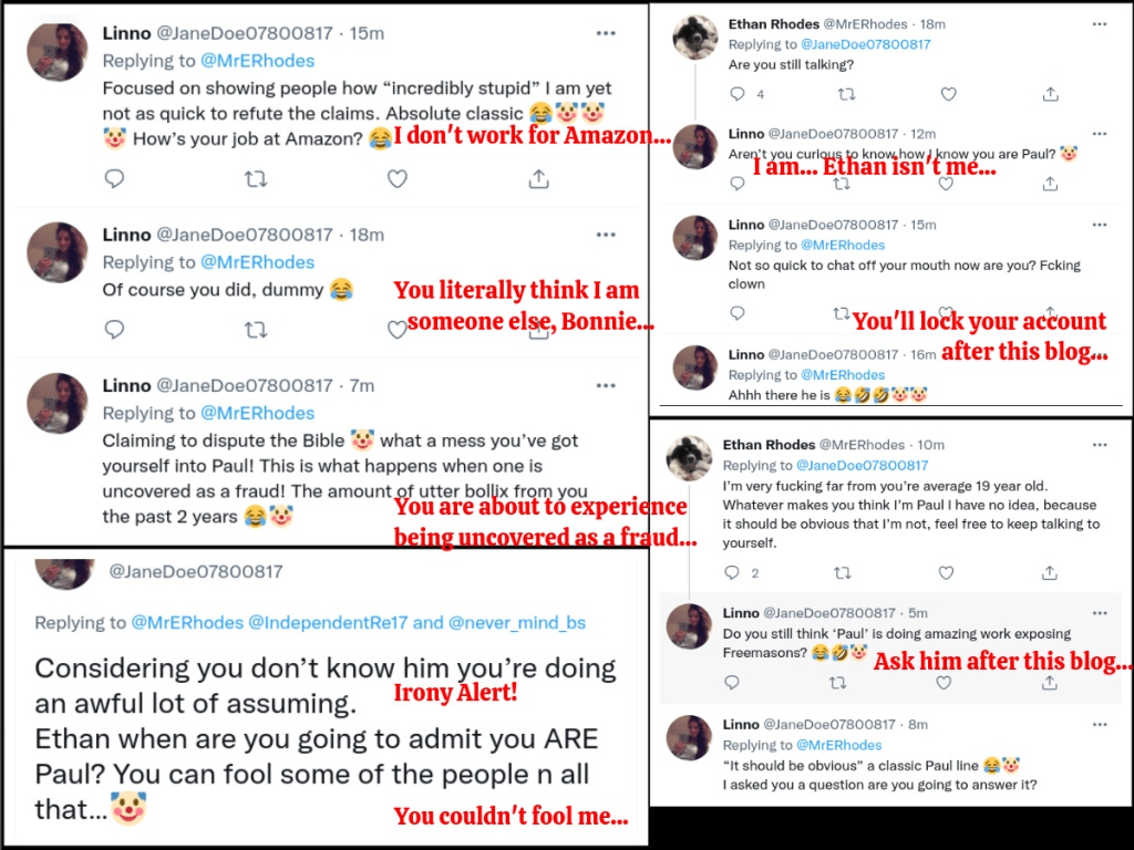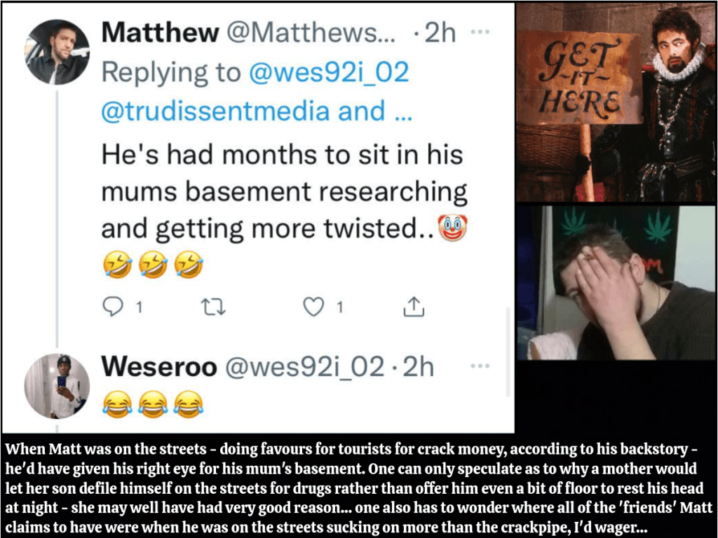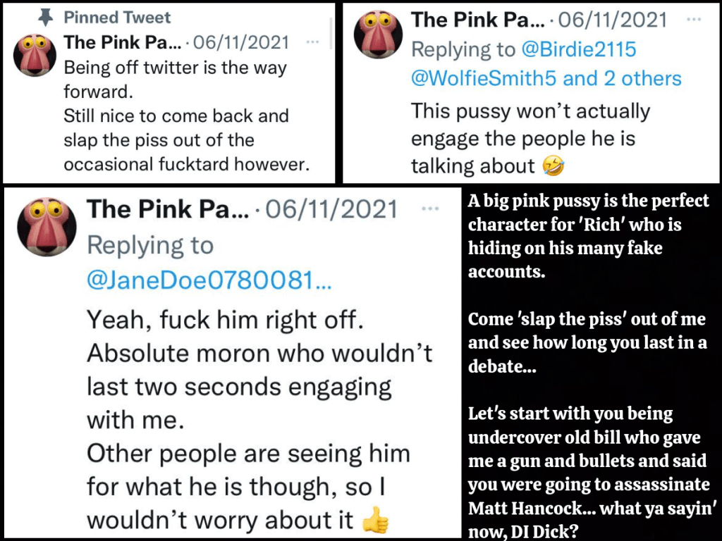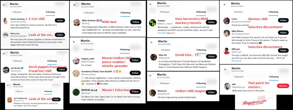 Luke and Matt did indeed refuse to acknowledge Jo’s ex’s patch when asked directly, Linno did indeed block and Rich is reduced to calling me ‘gay’ and making ‘mum jokes’ (read the room) whilst hiding behind his ‘Martin’ account because he is too ashamed to post as himself.