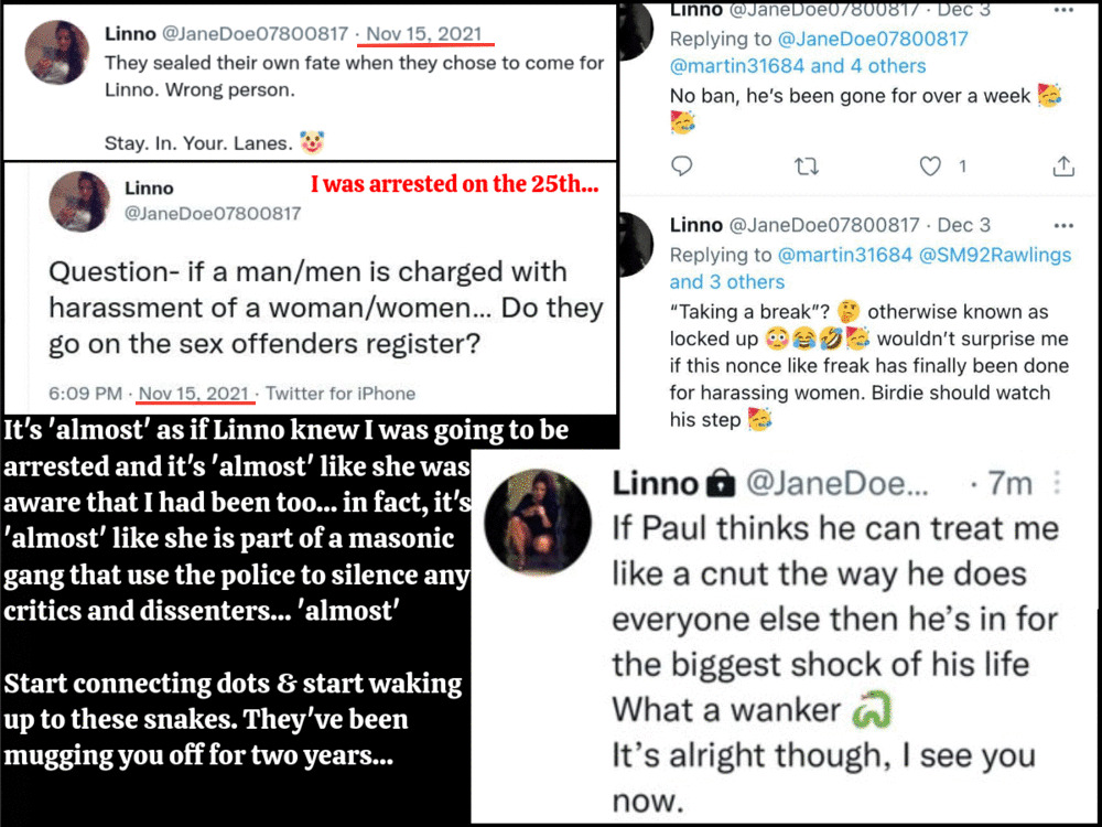 One has to question, not only the motives of the police involvement, but also the timing of the arrest. You see, the police have told me that Jo made her allegations on the 18th May 2021 – two days after the alleged ‘Malicious Comms’ were made – so why did it take the police six months to question me? As many of you will know, all of these cowardly Twitter freemasons have shared my address so it’s not like the police didn’t know where I was, is it?
