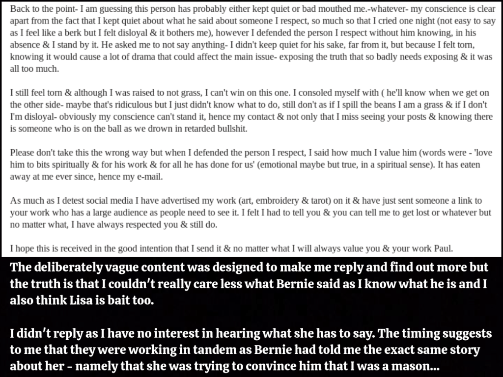 Unlike Bernie, I am not telling you to ignore him and I am not trying to smear his information – that’s what freemasons do, as Bernie tells you himself with his revelation of the method. He tells a lot of truth and anyone starting to wake up can learn a lot by following him on Twitter. This is not a smear campaign by any means – if I wanted to smear him I could just e-mail Lisa back and pretend to be on her side and get more ‘dirt’ on him (although it would all be with his knowledge as they were working together on this plot).