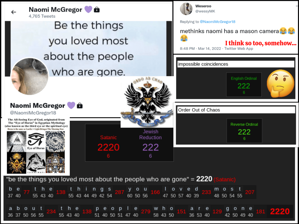 Jo’s daughter’s website (with odd spellings to make 222 for ‘Order Out of Chaos’ in my honest opinion) contains lots of freemasonic symbolism and random names/phrases that also throw up some ‘interesting’ numbers. Her other two daughters – including the one I have photos of making the hand signs – work for a law firm, part of yet another predominantly freemasonic industry. Now, you are free to put all of this together and say they are a series of about twenty ‘coincidences’ if you wish but don’t say you weren’t told. Incidentally, ‘impossible coincidences’ is also 222 in gematria…
