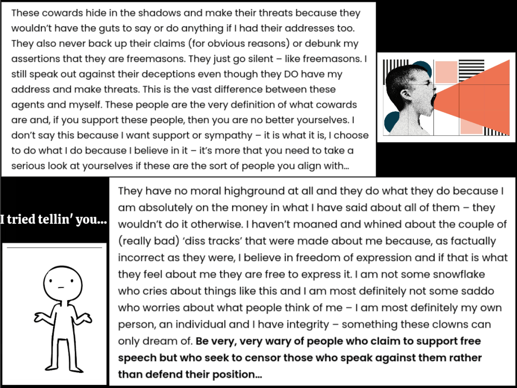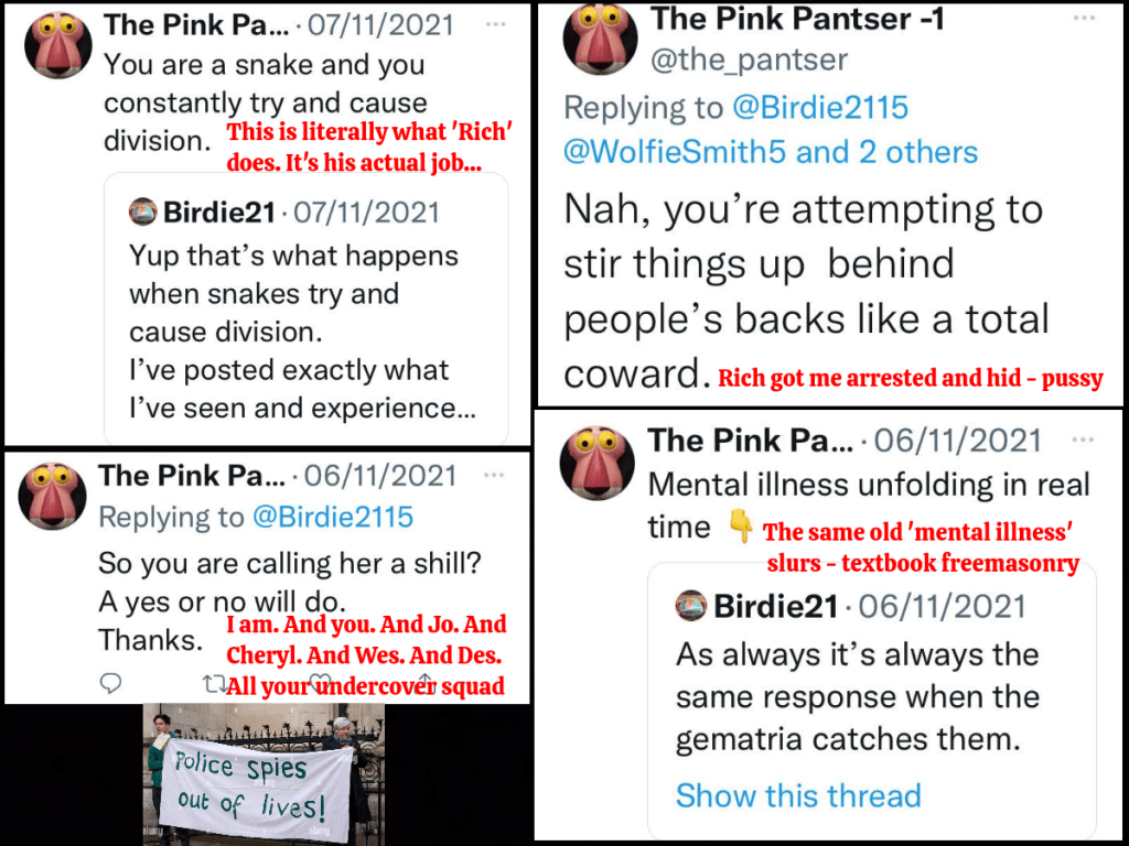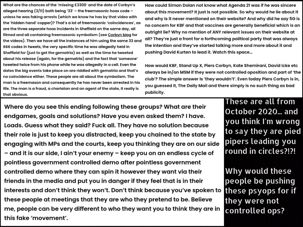 Before we begin, I’d just like to make it clear that nothing I am writing comes from a place of bitterness, anger or ‘revenge’. The people I will be writing about are, in my very honest and considered opinion, nothing more than freemasonic agents, crisis actors and grifters operating via social media to influence the narrative of the so-called ‘freedom’ and ‘truth’ movements (classic inversion there…) and to manipulate those that oppose the ‘Covid’ psyop – aided and abetted by the police force they pretend to oppose…