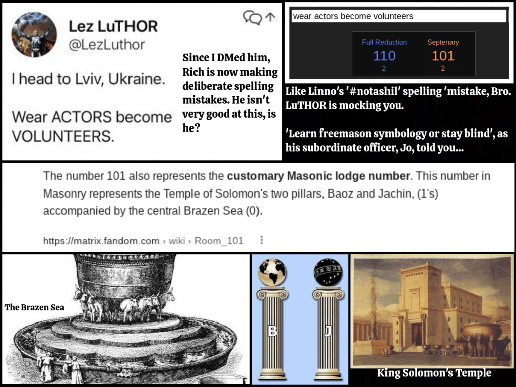 The biggest red flag for me, though, is his obsession with claiming that The Bible and Yahusha are psyops – because freemasons told him that The Bible was written by freemasons. If someone is pushing that hard against the truth of the gospels and of The Bible then there can be only one explanation in my opinion – they are serving the devil – and his gematria certainly would seem to indicate this…
