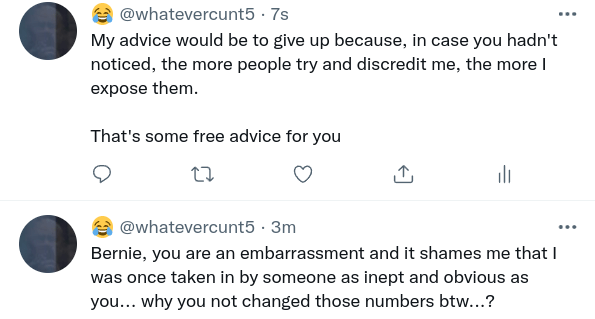 I know this for a number of reasons, not least because of his association with Lisa Leigh, another very suspect character who just so happened to e-mail me a few days after Bernie had DMed me for the first time in months in February telling the exact opposite story that Bernie had told about her a while ago…