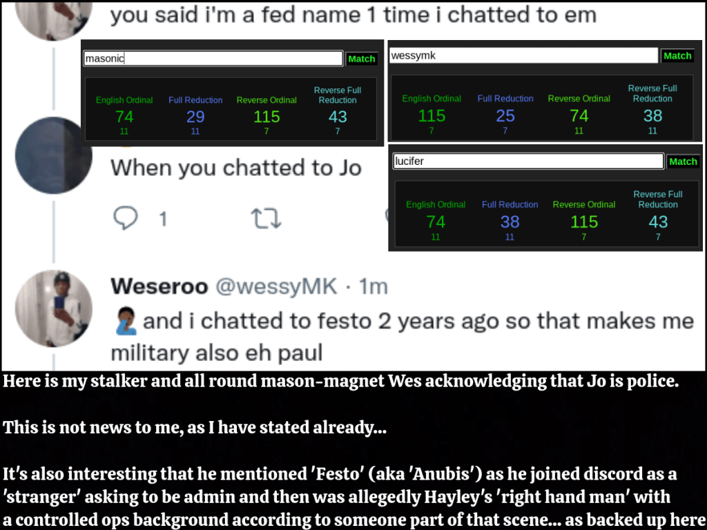 Now, you may say that these numbers are ‘coincidences’ and that many ‘innocent’ names and people could be wrongfully tainted – and this is absolutely true. As a freemasonic agent (who I believe to be Jo’s ‘handler’ – and we’ll get onto this cowardly snake in great detail later) told me himself – before his own gematria added to the weight of evidence against him: “gematria adds to other evidence already there” and this is certainly the case here and in the other cases I will be presenting later.