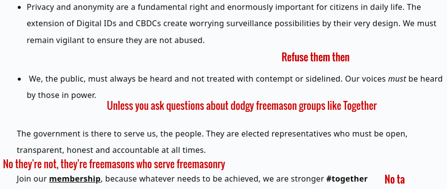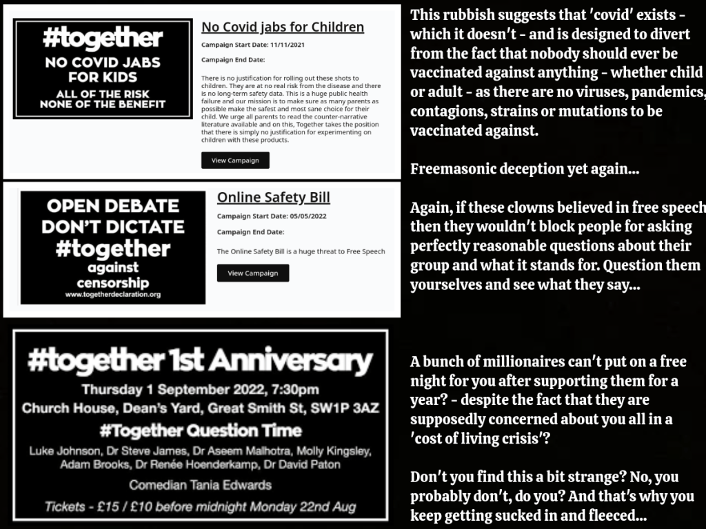 Like these groups, ‘Together’ absolutely pushes the same government narratives that I have just mentioned and, like these groups, they want to keep supposed ‘free thinkers’ absolutely tied to the beast system. This is because, like the other groups, they were created and are controlled by freemasons to deceive, divide and distract – as I said, freemasonry always operates in this way.