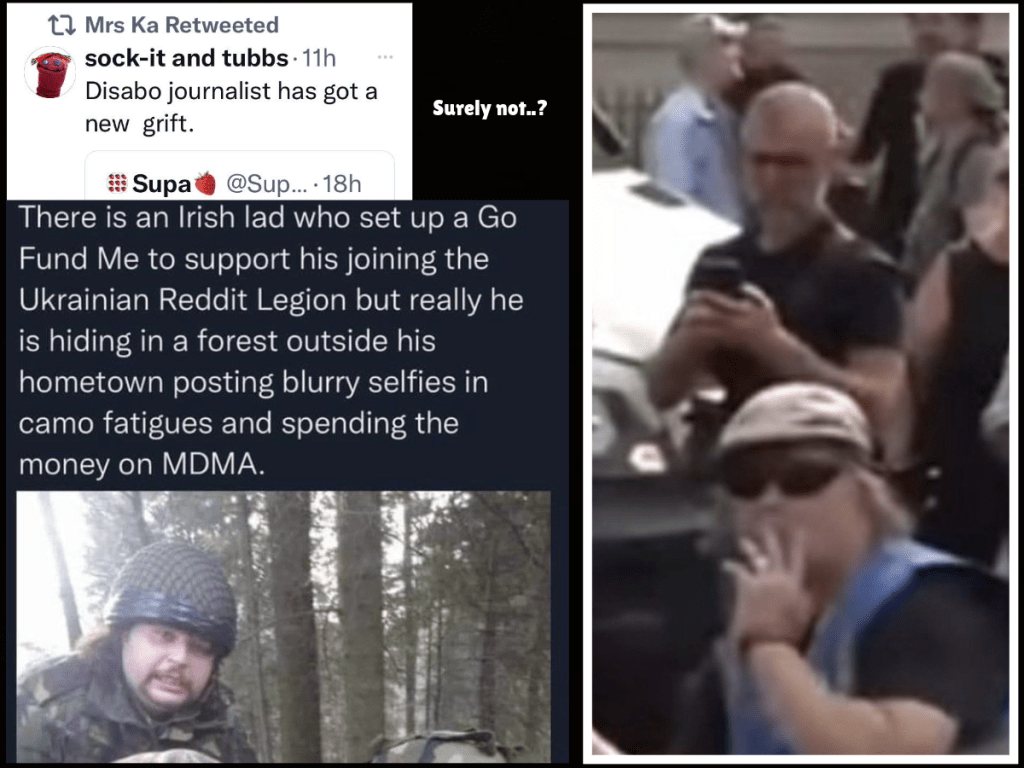 This very obvious one brings me on to her ‘white knight’ who I exposed in my previous blog about these agents and who goes by many names as he uses nothing but sock puppet accounts. As he likes to use fake names we will refer to him as Perry Combover because he looks like Bobby Charlton circa 1973 going by the photo he stupidly took whilst working for the government in Ukraine under his ‘Lez LuTHOR’ alias – in which he caught his own reflection in a photo he took. Something must have made him very worried because he didn’t have a combover (or white hair) when I met him in 2020…