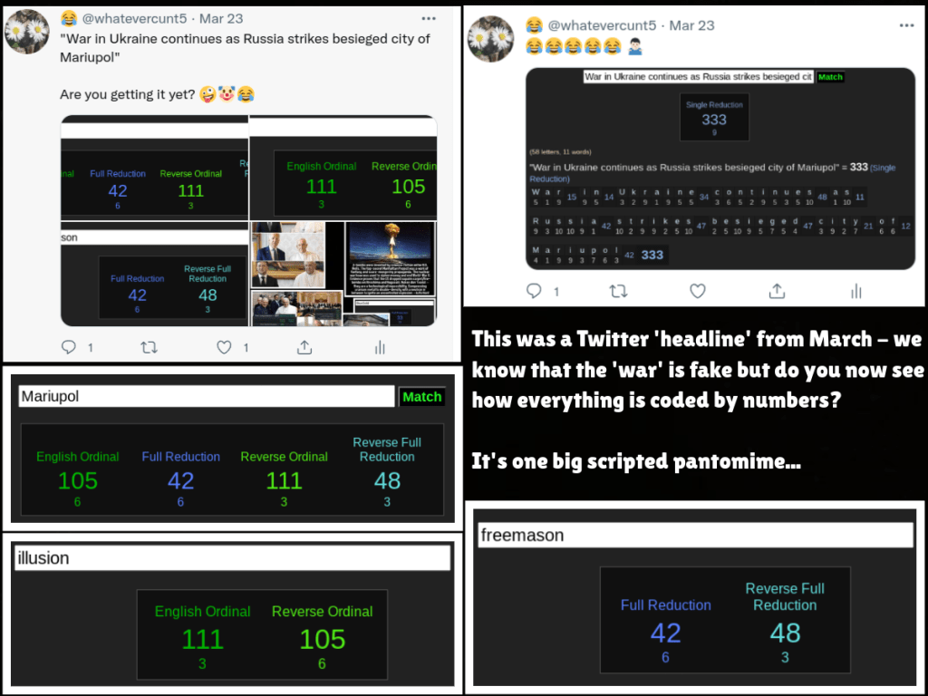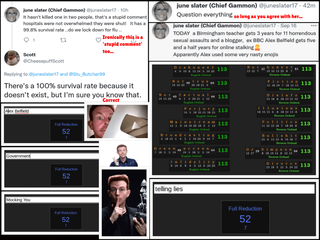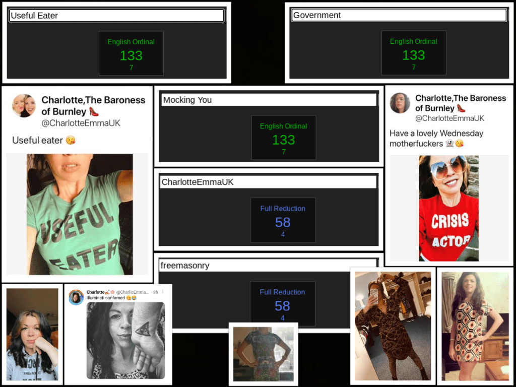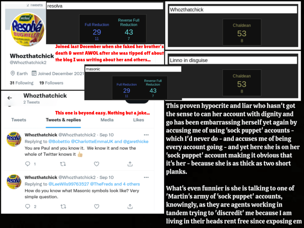 One of the other obvious things that gave her away that I forgot to mention previously is that, despite trying to cause a rift between myself and Andy by posting something I’d said about him in DM (but had already said to him beforehand), she failed to post a board I had made about another deceiver showing symbolism and gematria. Despite Linno and ‘Martin’ (on his ‘Pantser’ sock puppet account) supposedly being against this person and supposedly trying to cause a rift between us, she didn’t post the board even when she was having her meltdown about me saying she was a mason – which she is.