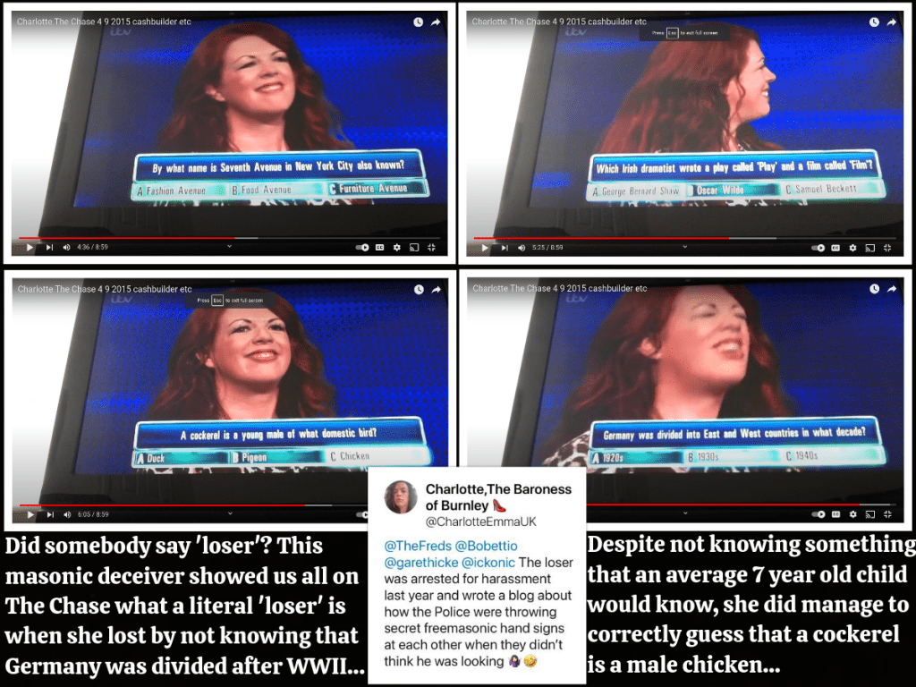 Firstly, this character only appeared after I had blocked one of his many other accounts, ‘Pantser’, and randomly targeted me out of nowhere because I rightly showed that Charlotte is a freemason and a controlled opposition gatekeeping shill. He then started saying the exact same things that ‘Pantser’ had been saying about Bevvie and EGI – what a ‘coincidence’…
