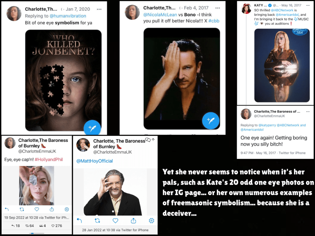 Even when ‘Bobettio’ pretended to have ‘outed’ Charlotte as being a shill he didn’t post the pics of her making freemasonic handsigns – just the one she posted herself on Twitter as a supposed ‘joke’ (that old chestnut)…