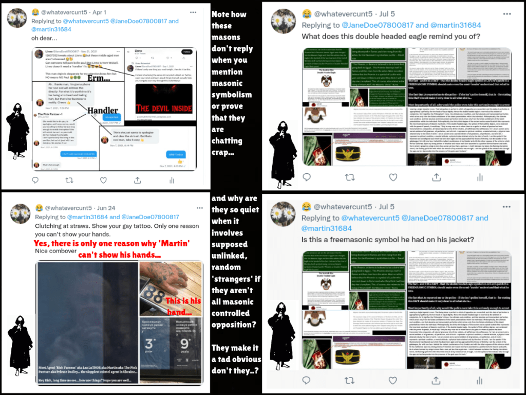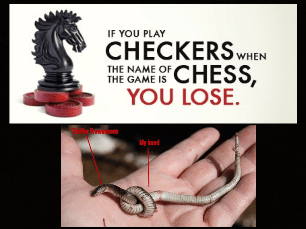 What is also stupid is the way that they have accused me of being genuine accounts with genuine followers – some of whom no doubt converse with them off of Twitter on other platforms and on the phone – which just makes it obvious to them and their followers that these idiots are agents with an agenda. They’ve even accused me of being some kid who their colleague Wes knows from Instagram and told them isn’t me – and they still persist because causing the chaos is what these masons do…