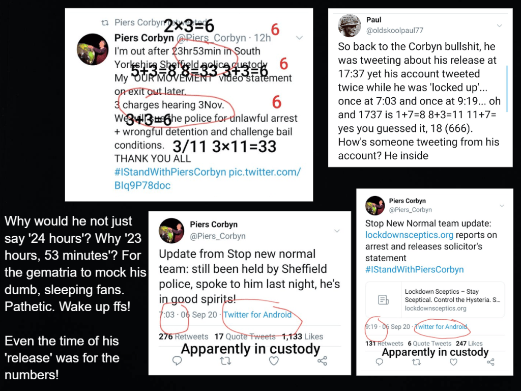 They use their puppet actors like Piers Corbyn, Kate Shemirani, Fiona Rose-Diamond etc to stage fake arrests and fines to make people fear speaking out, to make them more likely to comply with, and consent to, the ‘mandates’ that they were implementing and to make them seem legitimate. Freemasons do not get arrested and I have shown here how Piers Corbyn faked arrests and mocked his followers by using gematria and symbolism – because he is a freemason himself – which should have been obvious from the start when you consider his background and who his brother is…