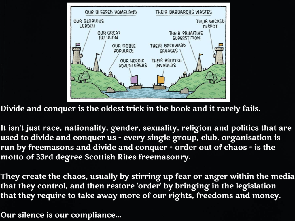 If you don’t understand that freemasons use divide and conquer tactics via Hegelian dialectics to divide, distract and deceive you into consenting to their agendas then I would suggest that you read this blog here too.