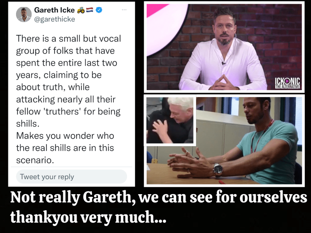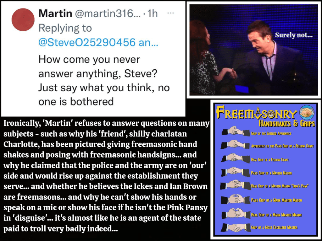 He accuses people of ‘deflecting’ and ‘avoiding questions’ but this is all this clown ever does when asked about Charlotte’s masonic handsigns or whether he thinks Ian Brown or Gareth Icke are freemasons or why he made that cringeworthy, lame statement about believing the police and the army are on our side and that they’ll come and save us from tyranny – now who would say something as daft as that other than an agent? No wonder he is too embarrassed to comment on it…