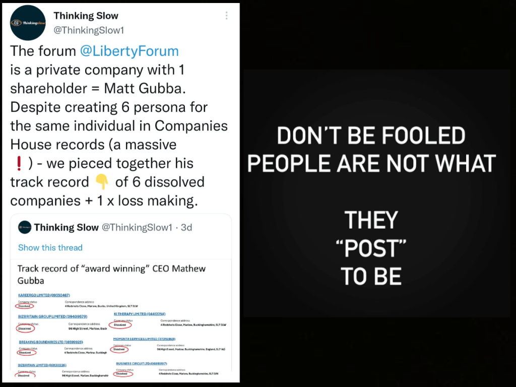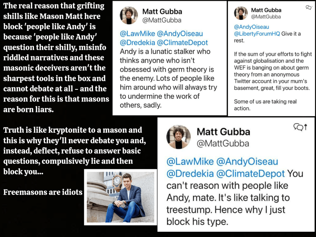 Andy Bird has done a great job in questioning this group and its members on Twitter and has exposed and rattled many of these grifters – to the point where they now all know who he is and have subjected him to the same masonic gaslighting that I have received myself at the hands of these predictable clowns.