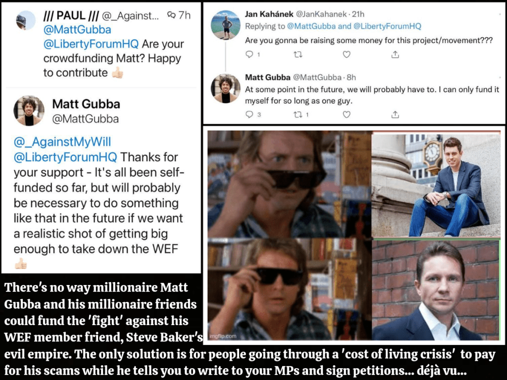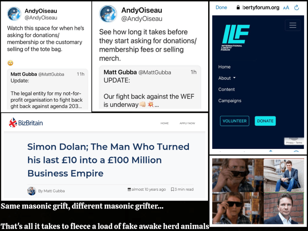 Gubba is yet another Simon Dolan clone and it amused me no end to discover that he had written about Dolan a decade ago and that Dolan supports his ‘BizBritain’ money lending (usury) scam. His current grift revolves around focusing solely on the WEF, just one of many Non-Governmental Organisations that encroach on our lives, and it involves pushing the cringeworthy narratives pushed by the likes of David Icke and the 100% controlled ‘Alt. Media’ that I mentioned earlier.
