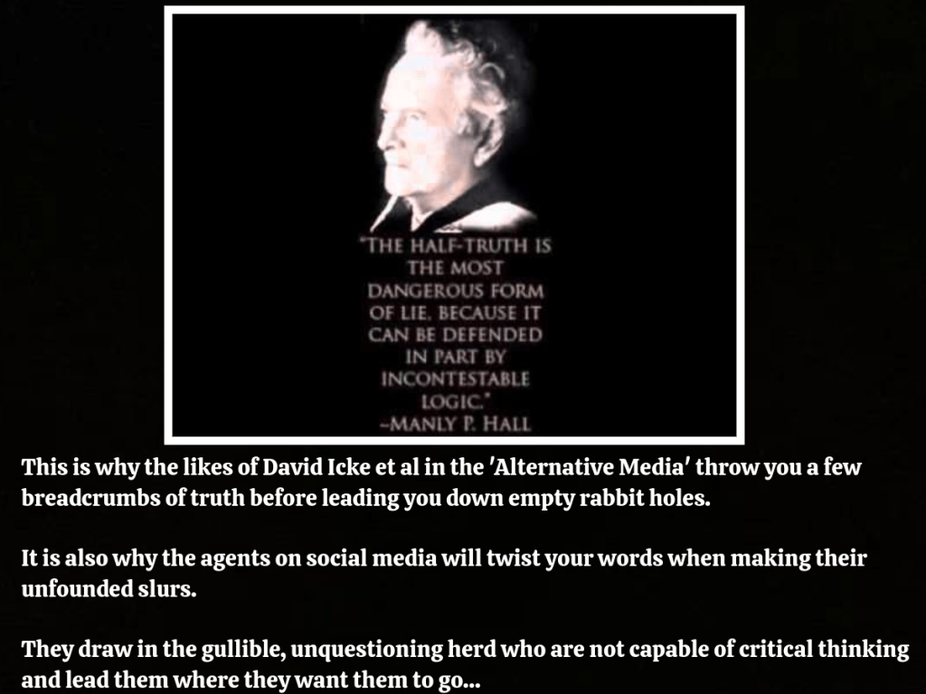 They tell us that they use half truths to deceive us because a half truth is the most powerful form of lie and yet many supposed ‘truthers’ fall for even the most obvious of shills such as David Icke, Alex Jones and, bizarrely, even Joe Rogan.